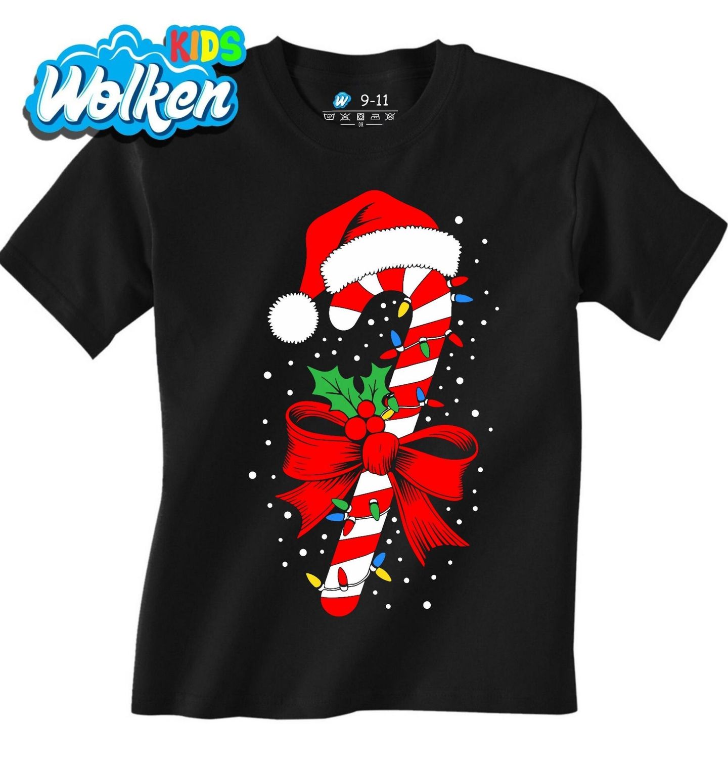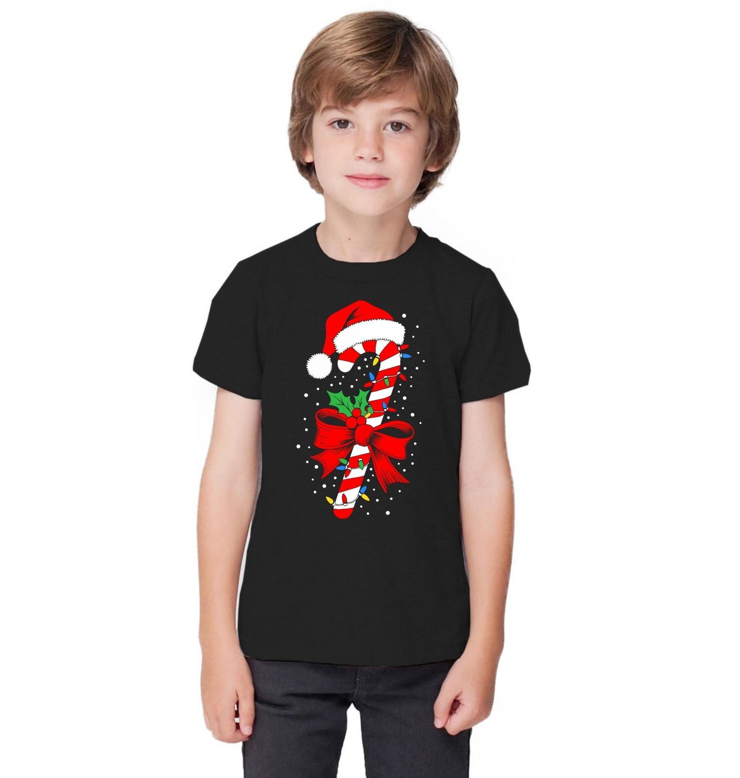 Dětské tričko Vánoční Cukrová Hůlka. Když se řeknou Vánoce, nesmí chybět sladkosti a typické dekorace. Tento motiv přináší tradiční vánoční cukrovou hůlku, ozdobenou červenou mašlí, cesmínou, světýlky a čepicí Santa Clause. Ideální pro všechny, kdo milují vánoční pohodu, barvy a klasické sladké symboly Vánoc.
