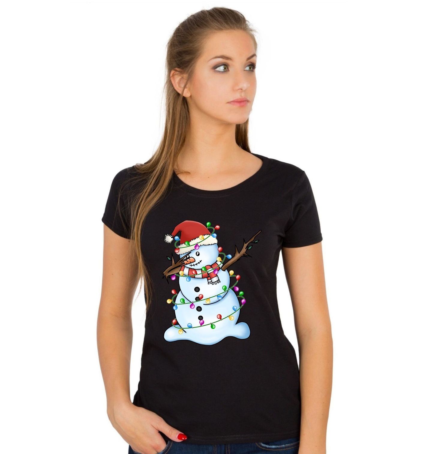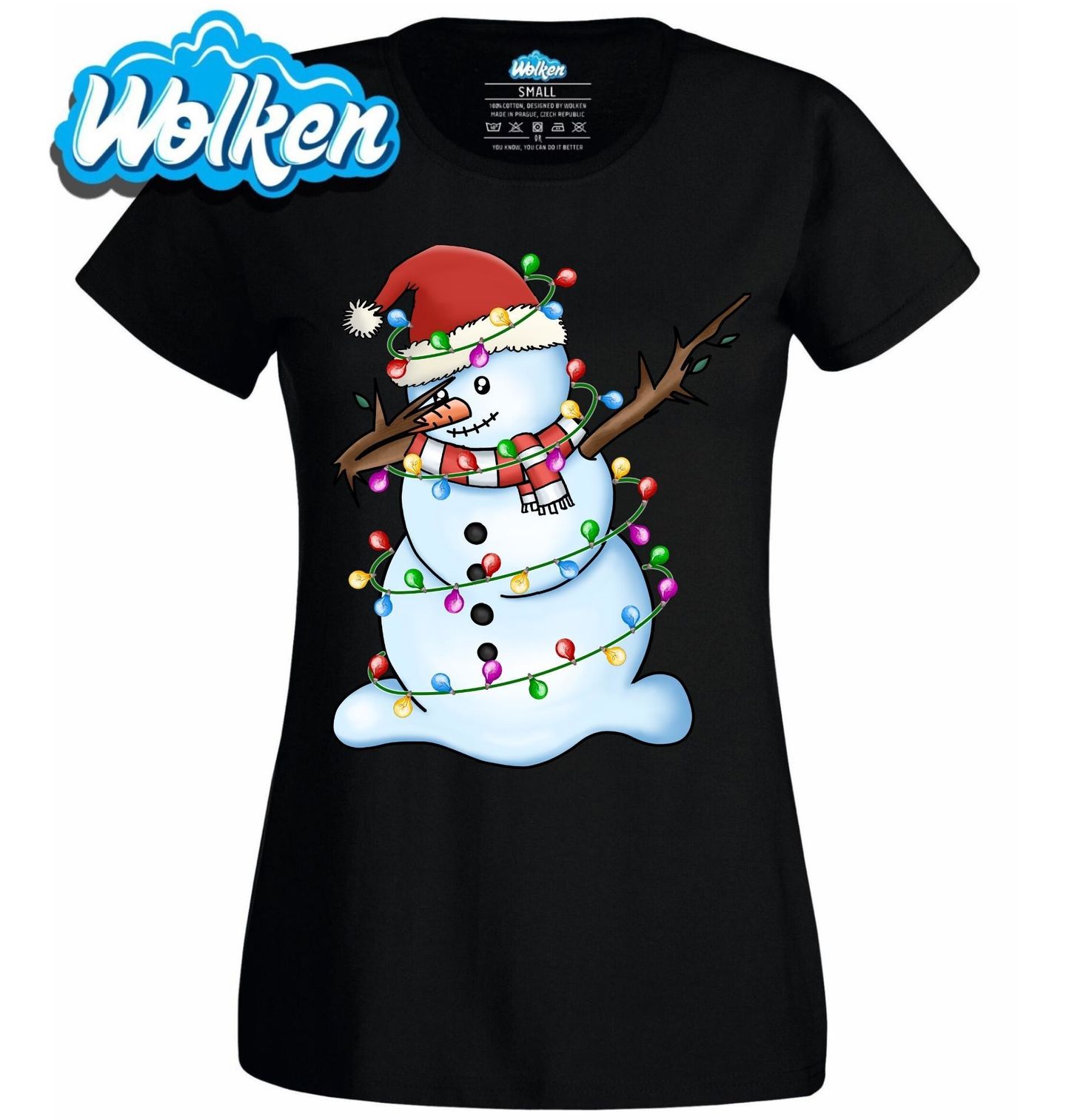 Dámské tričko Vánoční Dabující Sněhulák. Tento cool sněhulák ví, co frčí! S vánoční čepicí, světýlky a ikonickým pohybem „dab“ rozjíždí zimní párty jako profík. Ideální design pro všechny, kdo milují Vánoce s humorem, styl a sváteční originalitu. Sněhulák, který nejen mrazí, ale hlavně baví!