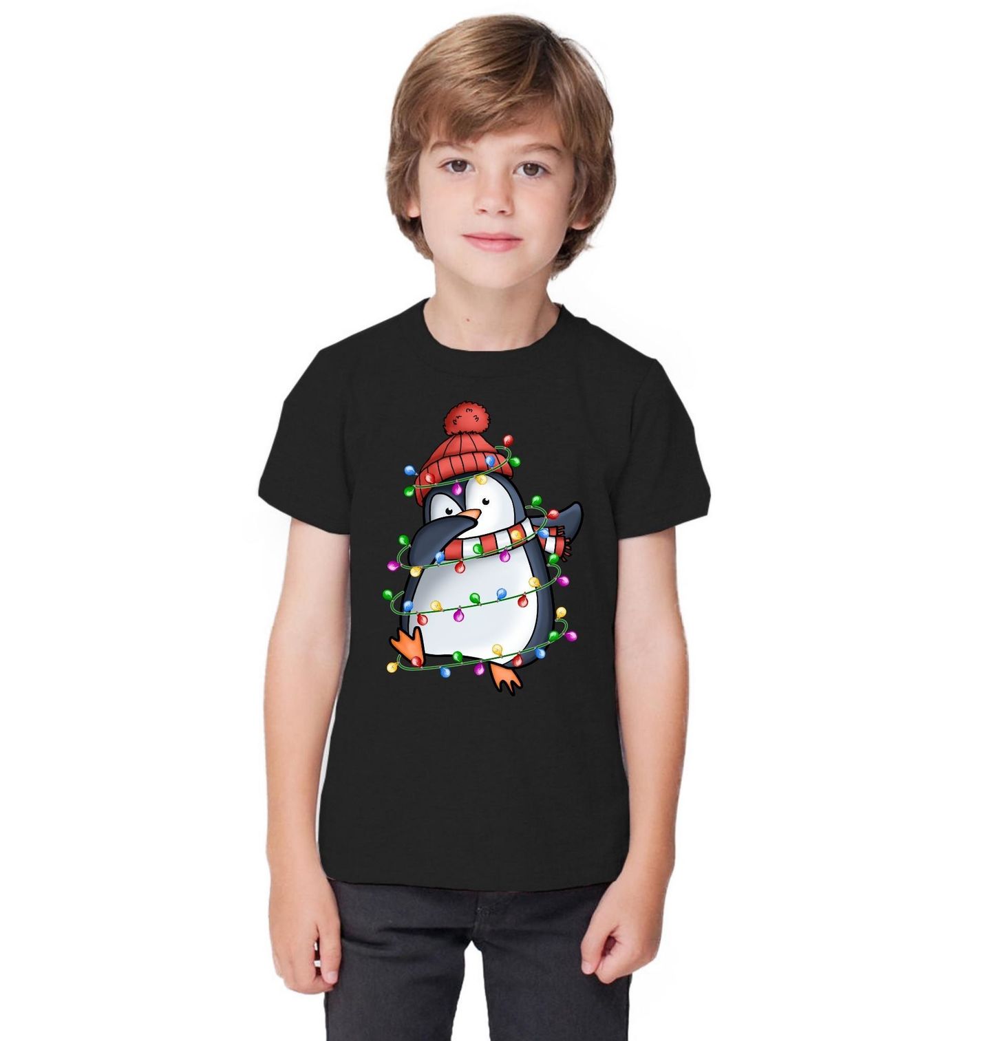 Dětské tričko Vánoční Dabující Tučňák. Roztomilý tučnák, který ovládl taneční parket svým „dabem“, je zpět – tentokrát ve vánoční výzdobě! Omotaný světýlky, s čepicí a šálou, šíří sváteční náladu a přináší úsměv každému, kdo miluje Vánoce s humorem a stylem.