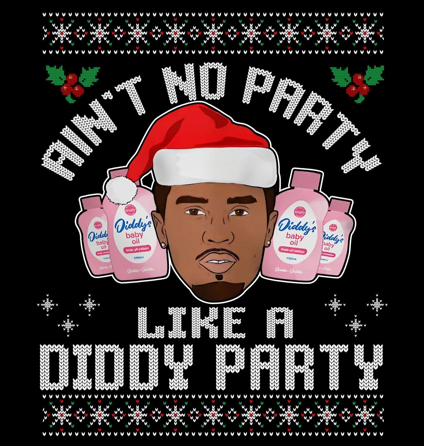 Pánské tričko Vánoční Diddyho Párty. Připrav se na Vánoce, které nikdo nezapomene! Tento originální ugly sweater je parodie na slavného rappera a producenta Diddyho a jeho legendární party styl. Kombinace Santa čepice, „Diddyho“ dětského oleje a nápisu „Ain’t no party like a Diddy party“ - Není žádná párty jako Diddyho párty.