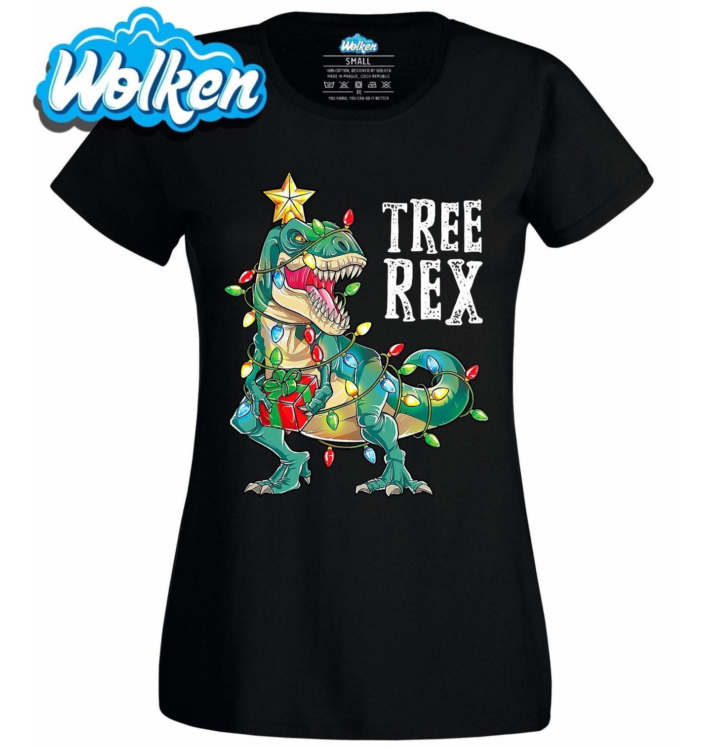 Dámské tričko Vánoční Dinosaurus T-Rex Tree Rex. Vánoce dostávají nový prehistorický rozměr! Tento vtipný motiv spojuje nejslavnějšího dinosaura T-Rexe s vánočním stromečkem. „Tree Rex“ je slovní hříčka, která vznikla spojením anglického slova tree (strom) a jména T-Rex.