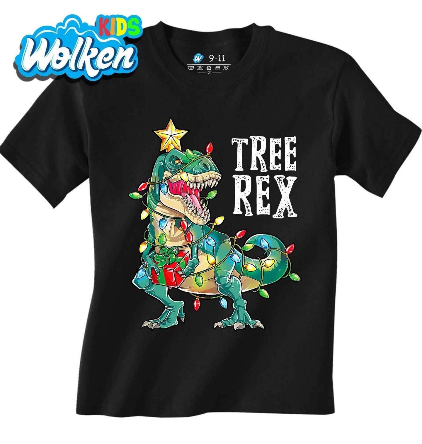 Dětské tričko Vánoční Dinosaurus T-Rex Tree Rex. Vánoce dostávají nový prehistorický rozměr! Tento vtipný motiv spojuje nejslavnějšího dinosaura T-Rexe s vánočním stromečkem. „Tree Rex“ je slovní hříčka, která vznikla spojením anglického slova tree (strom) a jména T-Rex.