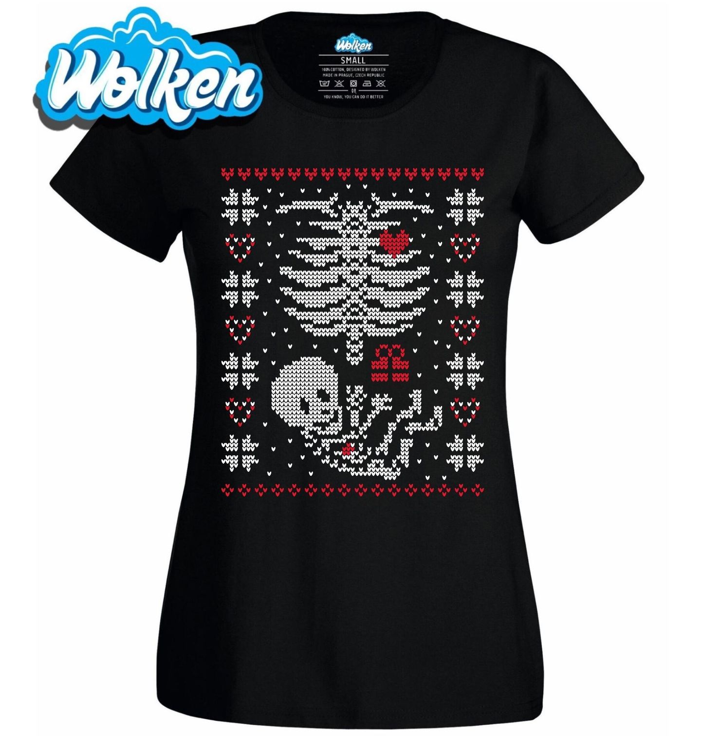 Dámské tričko Vánoční Dítě Kostlivce. Tento neobvyklý design přináší temný pohled na Vánoce – dětský kostlivec odpočívající pod vánočním stromkem s dárky. Vše je stylizováno do typického ugly sweater vzoru, který zaujme každého, kdo má rád černý humor nebo nekonvenční pojetí svátků.