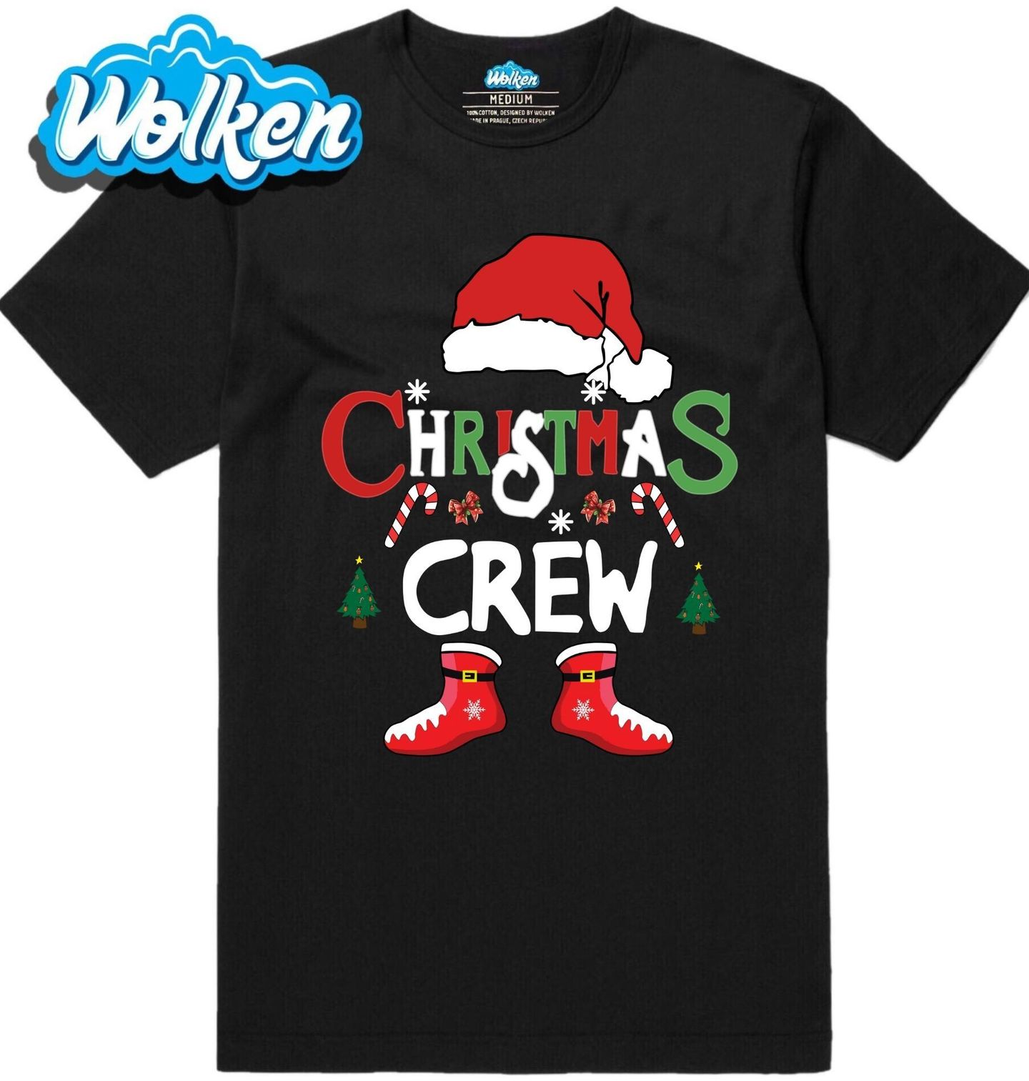Pánské tričko Vánoční Elfí Parta Christmas Crew. Na designu najdete nápis „Christmas Crew“ stylizovaný do tradičních vánočních barev – červené, zelené a bílé – doplněný o Santovu čepici, vánoční stromečky, hůlky z cukrové třtiny, mašličky a typické elfí boty.