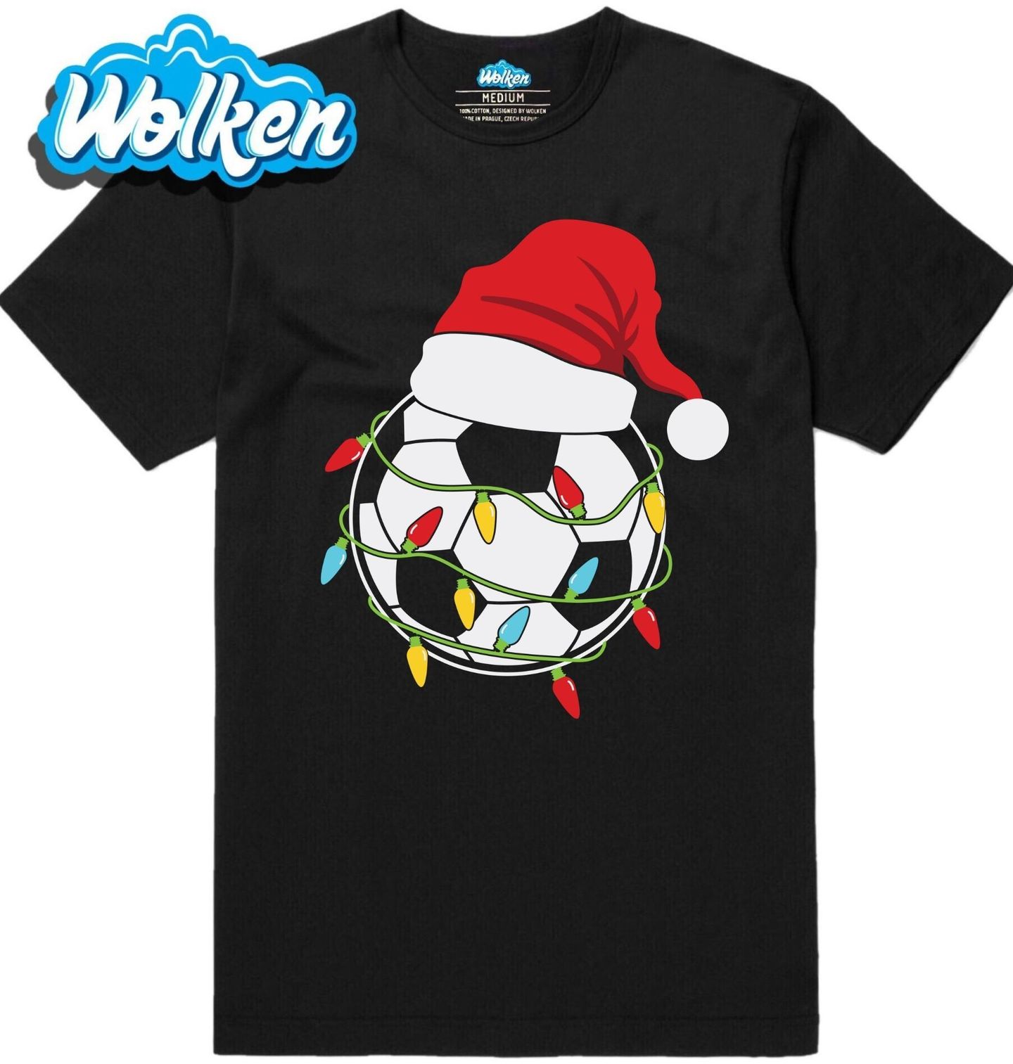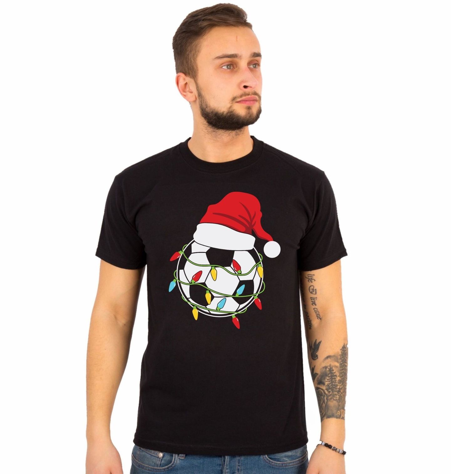 Pánské tričko Vánoční Fotbalový Míč s Čepicí. Vánoce už nejsou jen o stromečku a kaprovi! S tímto originálním motivem pro všechny fanoušky fotbalu si můžeš svátky užít v ryze sportovním duchu. Na motivu je klasický míč, ozdobený barevnými vánočními světýlky a nasazenou červenou santovskou čepicí – ideální spojení sportu a Vánoc.