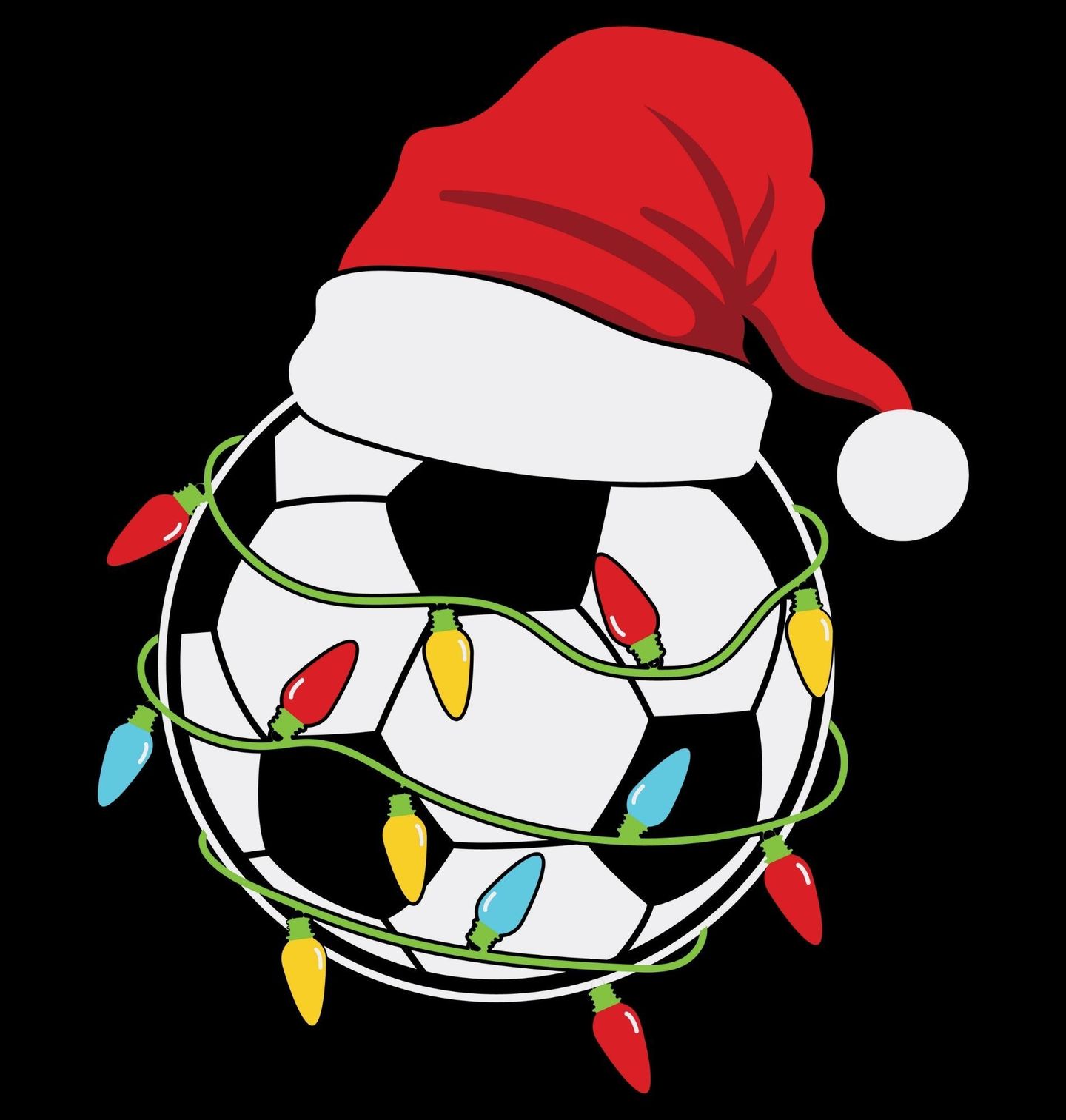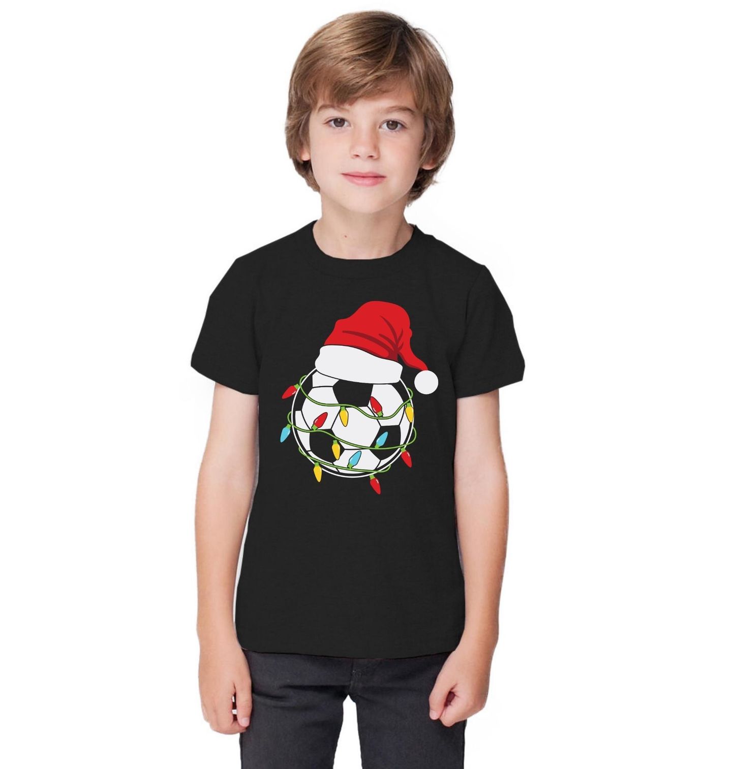Dětské tričko Vánoční Fotbalový Míč s Čepicí. Vánoce už nejsou jen o stromečku a kaprovi! S tímto originálním motivem pro všechny fanoušky fotbalu si můžeš svátky užít v ryze sportovním duchu. Na motivu je klasický míč, ozdobený barevnými vánočními světýlky a nasazenou červenou santovskou čepicí – ideální spojení sportu a Vánoc.