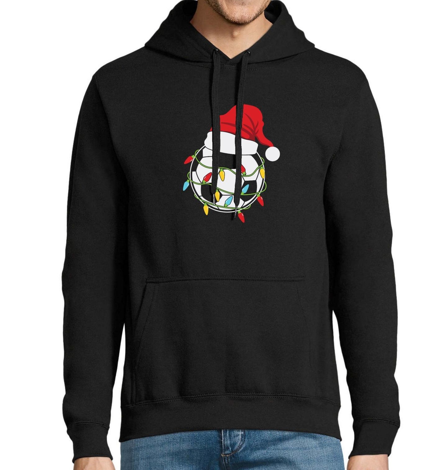 Pánská mikina Vánoční Fotbalový Míč s Čepicí. Vánoce už nejsou jen o stromečku a kaprovi! S tímto originálním motivem pro všechny fanoušky fotbalu si můžeš svátky užít v ryze sportovním duchu. Na motivu je klasický míč, ozdobený barevnými vánočními světýlky a nasazenou červenou santovskou čepicí – ideální spojení sportu a Vánoc.