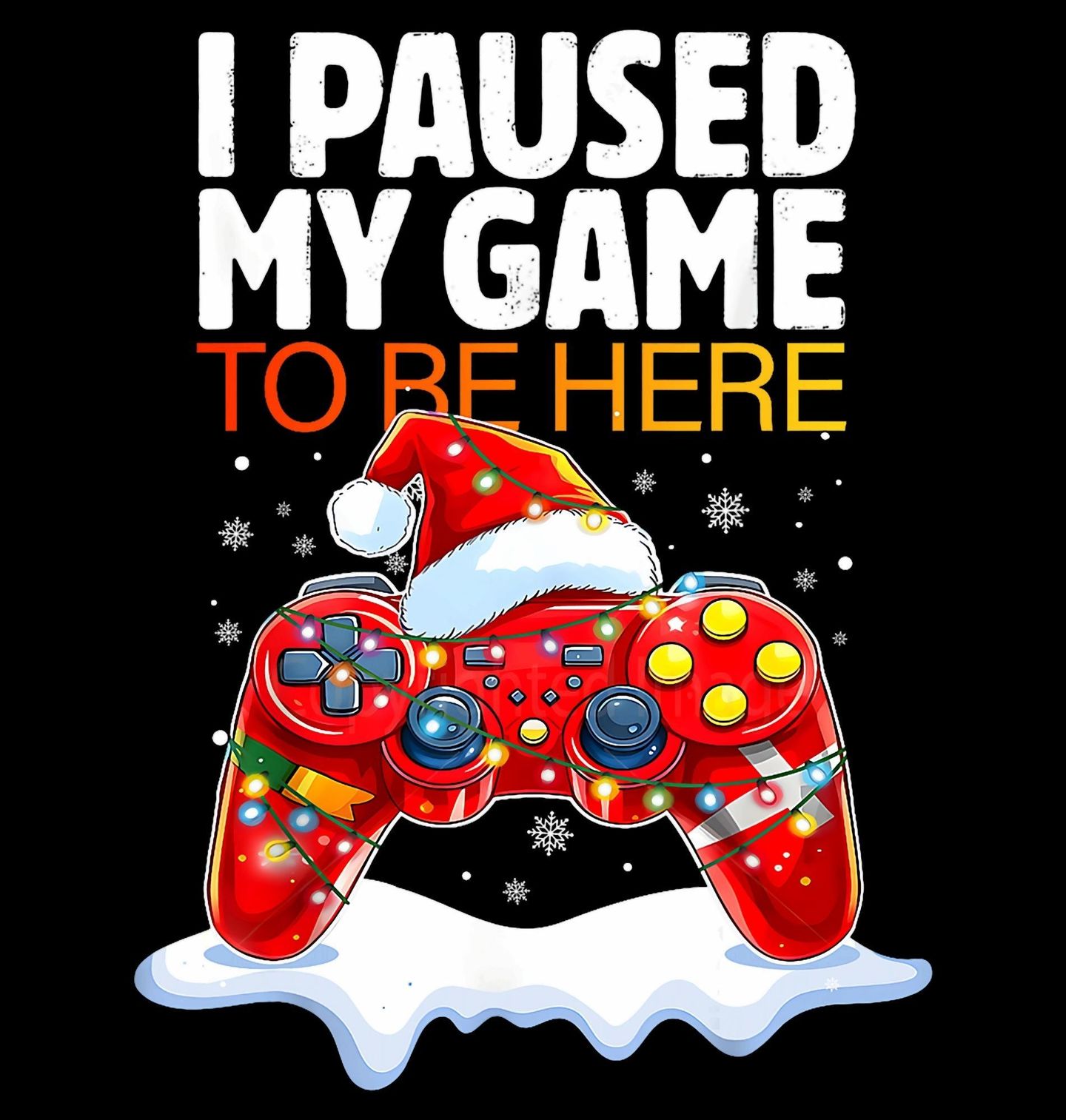 Pánské tričko Vánoční Gamer. Na obrázku je červený herní ovladač ozdobený vánočními světýlky a nasazenou čepicí Santa Clause. Nad ním je anglický nápis: „I paused my game to be here“, což v překladu znamená: „Pozastavil jsem hru, abych tu byl.“ Ideální dárek pro každého hráče, který miluje Vánoce.