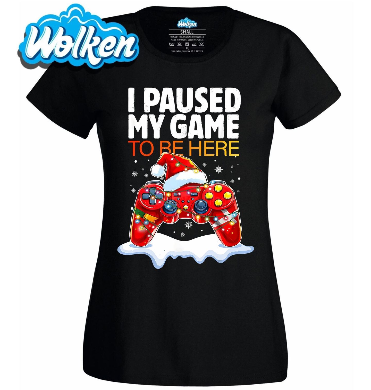 Dámské tričko Vánoční Gamer. Na obrázku je červený herní ovladač ozdobený vánočními světýlky a nasazenou čepicí Santa Clause. Nad ním je anglický nápis: „I paused my game to be here“, což v překladu znamená: „Pozastavil jsem hru, abych tu byl.“ Ideální dárek pro každého hráče, který miluje Vánoce.