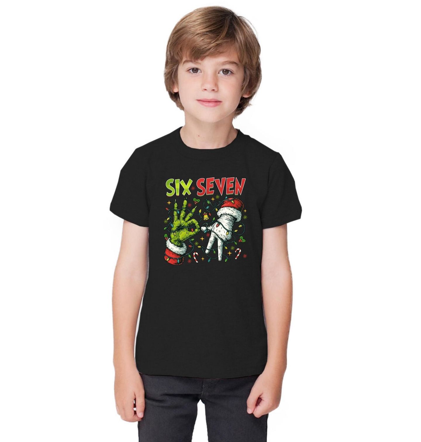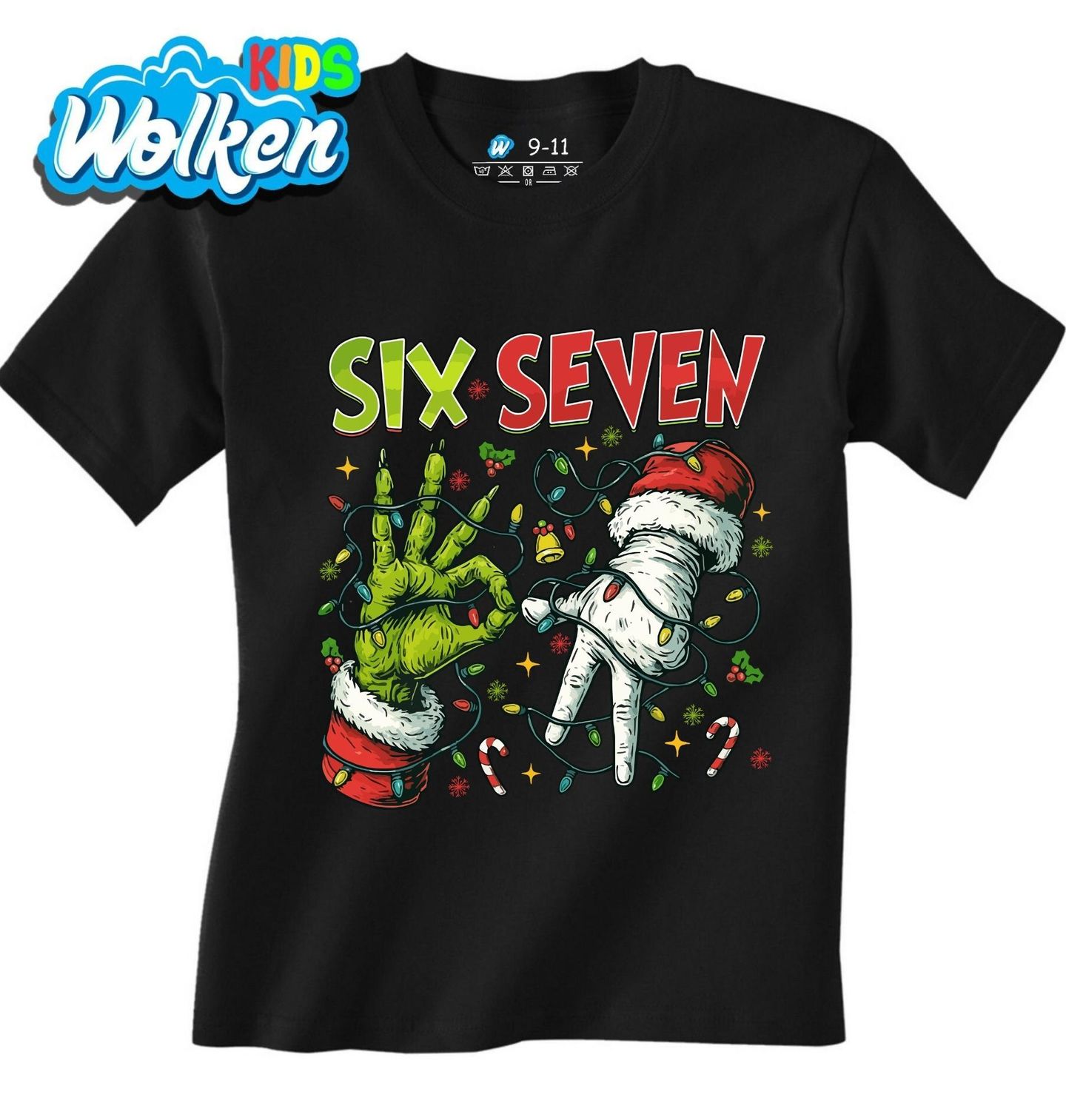 Dětské tričko Vánoční Grinchova 67 Six Seven. Vánoční motiv SIX SEVEN (67) spojuje dva ikonické symboly – santa a grinch – v jedné vtipné a stylové ilustraci. Grinchova zelená ruka ukazuje číslo 6, zatímco Santova bílá rukavice dává 7. Společně tvoří symboliku „67“ doplněnou o vánoční světýlka, lízátka a barevné detaily.