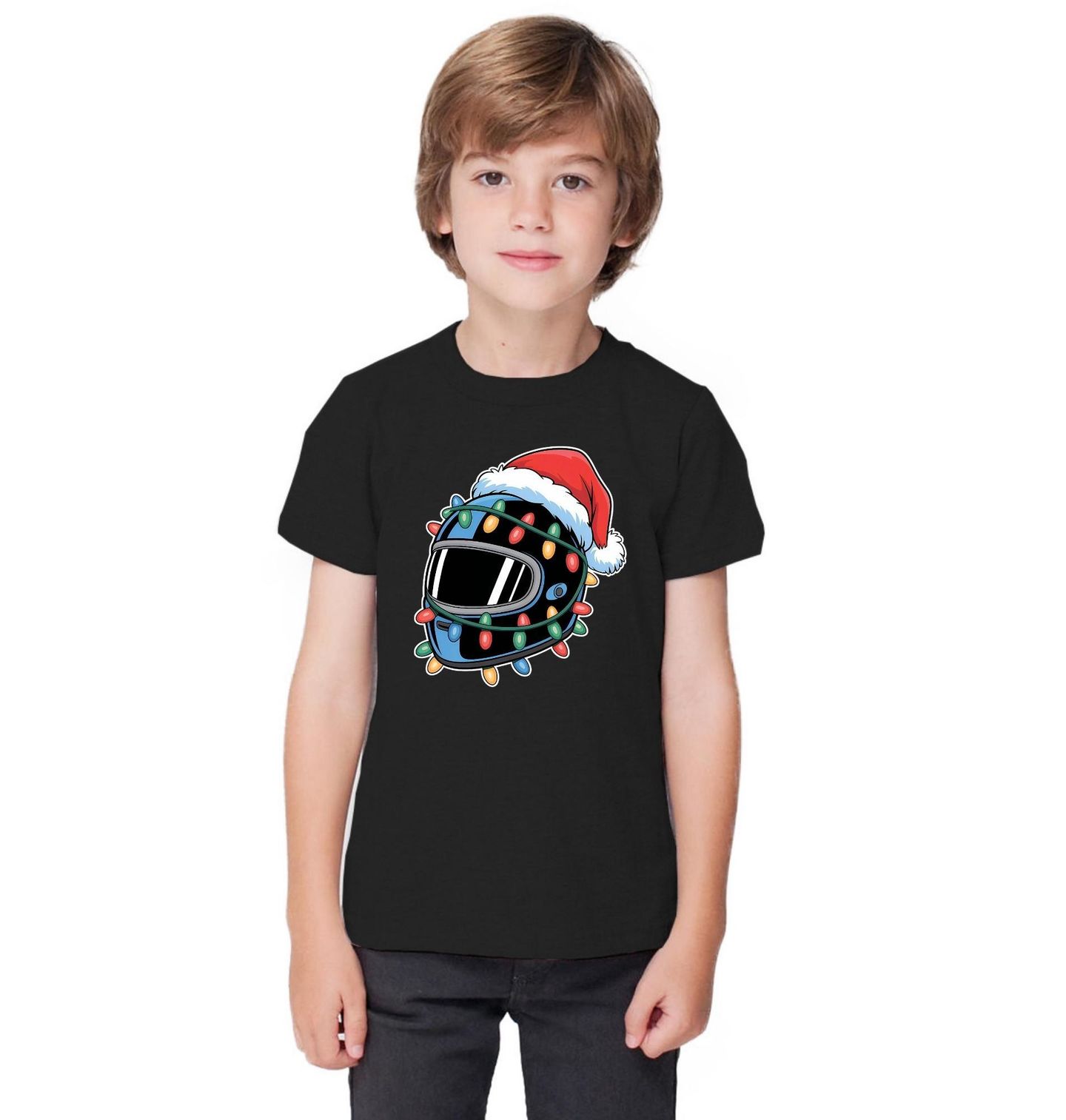Dětské tričko Vánoční Helma Motorkáře. Připravte se na sváteční jízdu! Tento originální motiv spojuje radost z rychlosti a kouzlo svátků – helma ozdobená barevnými světýlky a čepicí Santa Clause potěší každého fanouška jedné stopy. Vánoce, helma, motorka – tři věci, které patří k sobě, když chcete propojit sváteční atmosféru s láskou k cestám.
