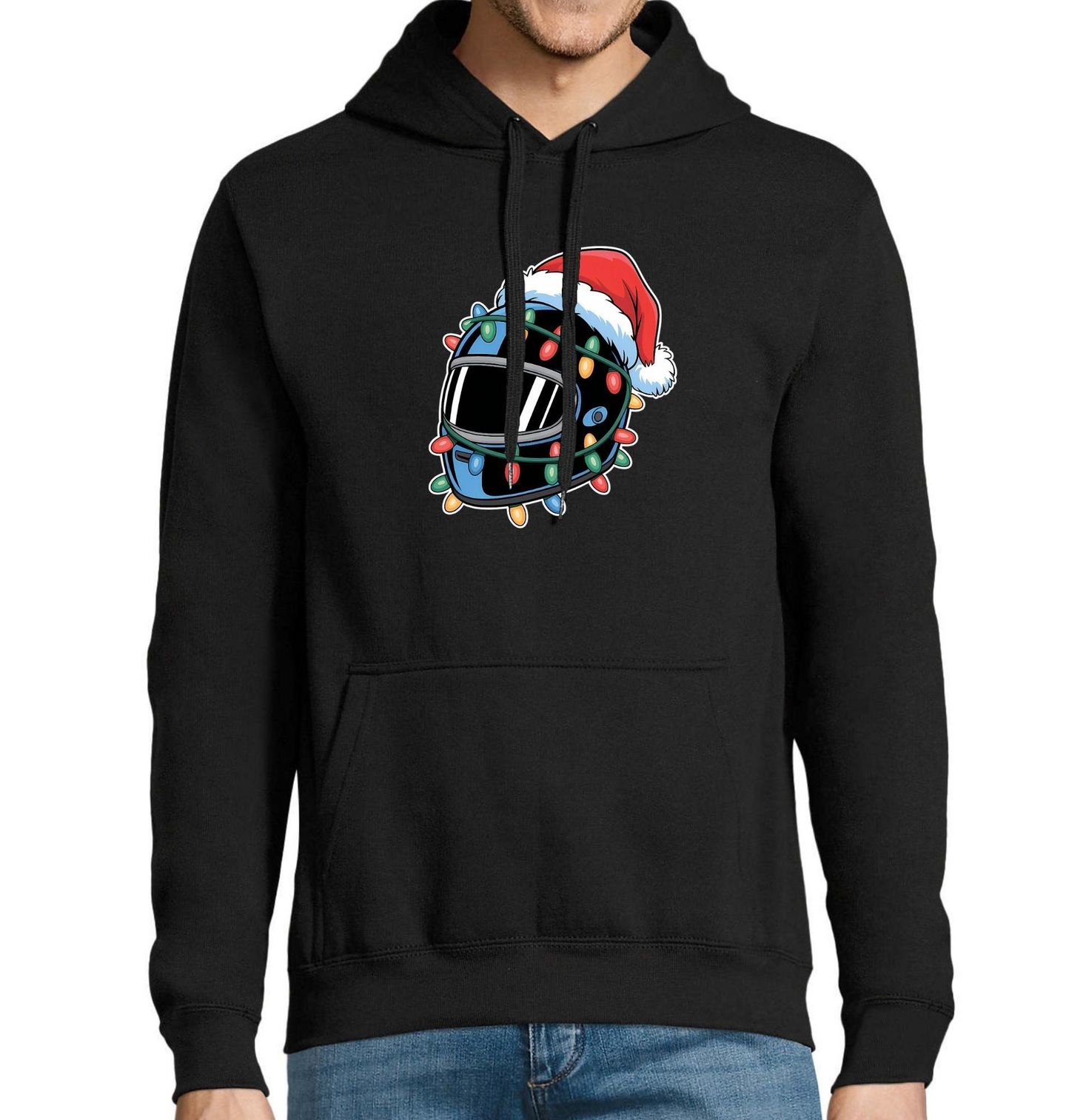 Pánská mikina Vánoční Helma Motorkáře. Připravte se na sváteční jízdu! Tento originální motiv spojuje radost z rychlosti a kouzlo svátků – helma ozdobená barevnými světýlky a čepicí Santa Clause potěší každého fanouška jedné stopy. Vánoce, helma, motorka – tři věci, které patří k sobě, když chcete propojit sváteční atmosféru s láskou k cestám.