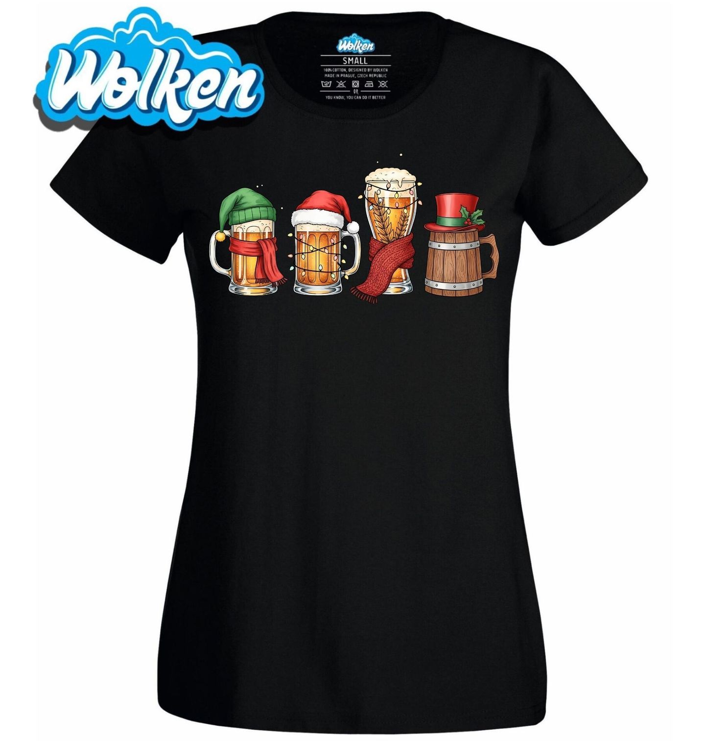 Dámské tričko Vánoční Hospodské Pivo. Pivní sklenice i soudky tu slaví stylově – s čepicemi, šálami, světýlky a pěnou až po okraj. Ideální motiv pro všechny milovníky piva, kteří chtějí ukázat, že Vánoce si umí užít po svém – se sklenicí v ruce a úsměvem na tváři. Skvělé jako dárek pro každého pivaře.