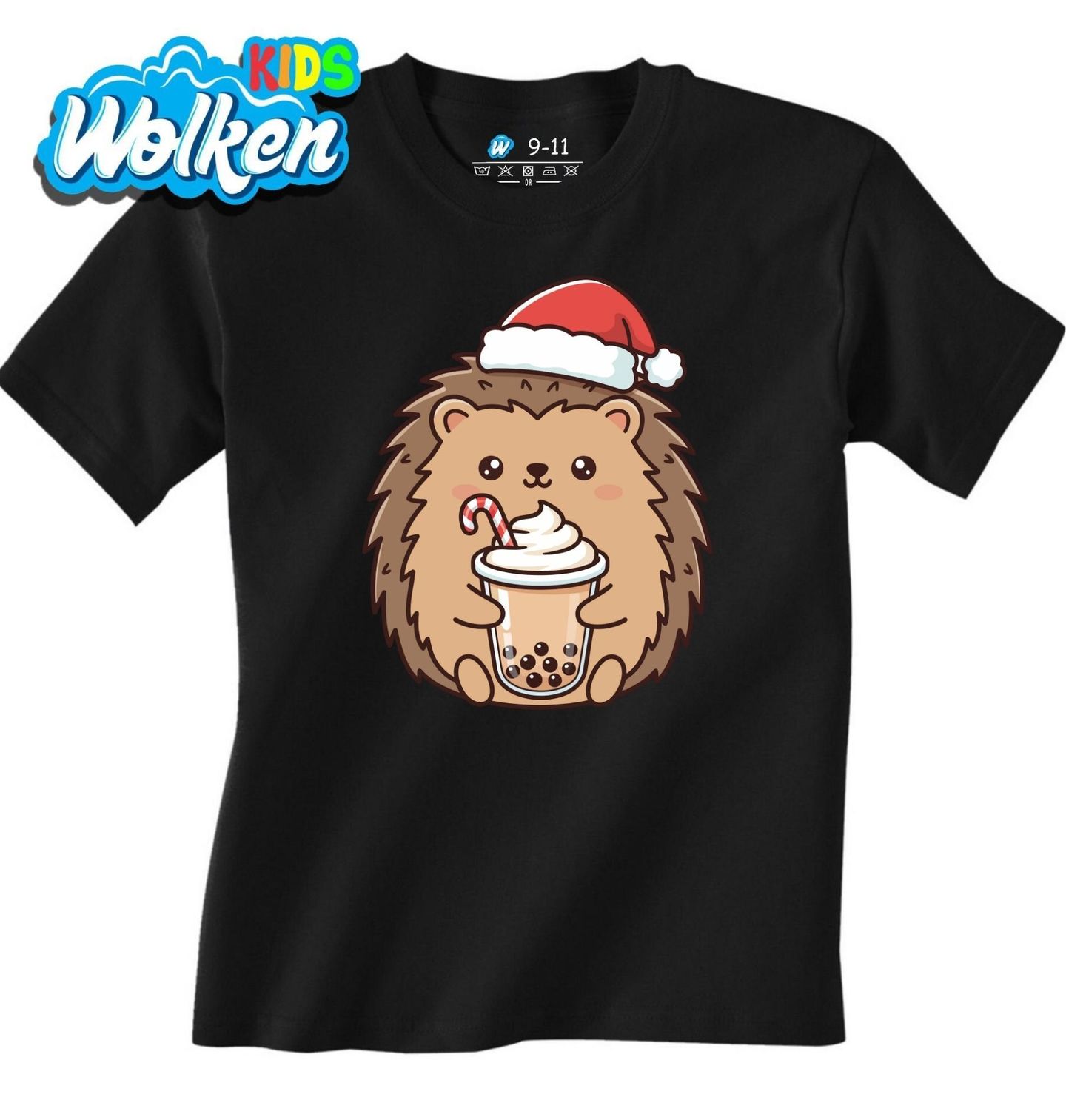 Dětské tričko Vánoční Ježek s Bubble Tea. Roztomilý ježek v červené vánoční čepici si právě pochutnává na skvělém bubble tea s krémem a cukrovou hůlkou – a celý motiv dýchá pohodovou sváteční atmosférou. Spojení ježka a bubble tea je neotřelé, veselé a ideální pro každého, kdo miluje Vánoce.