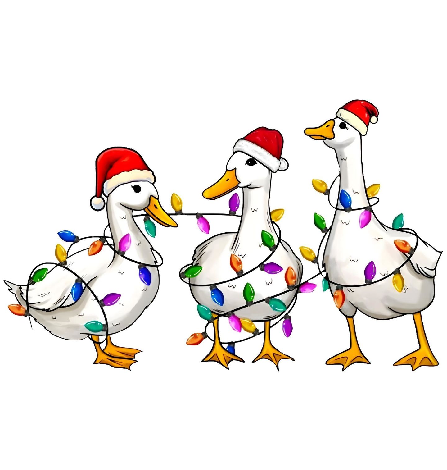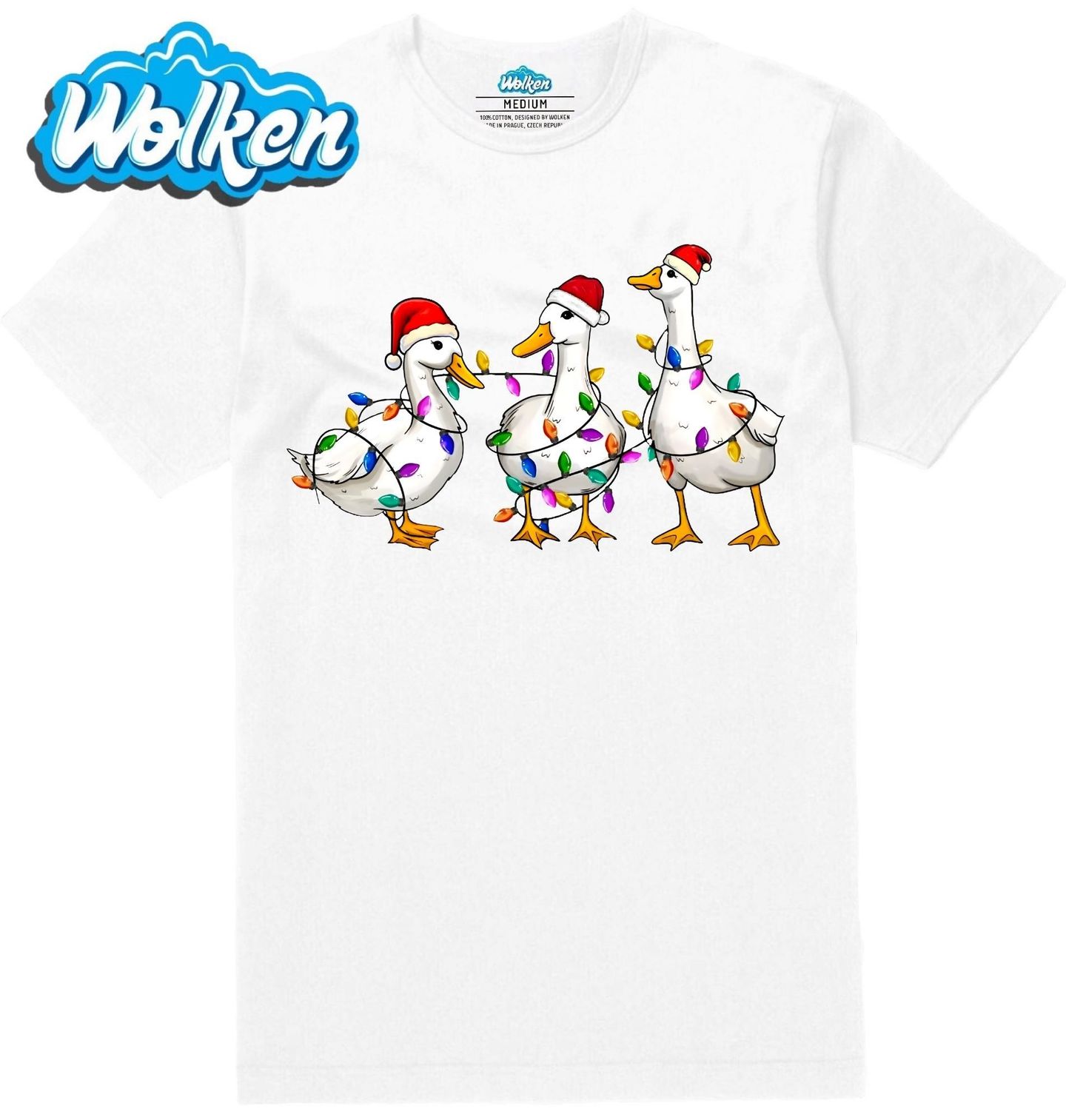 Pánské tričko Vánoční Kachny ve Světýlkách. Vánoce nemusí být jen o sobích — může to být i veselá kachna, každá v santovské čepici a omotaná barevnými vánočními světýlky! Tento originální motiv si zamiluje každý milovník zvířat, veselé nálady a netradičních vánočních vzorů.