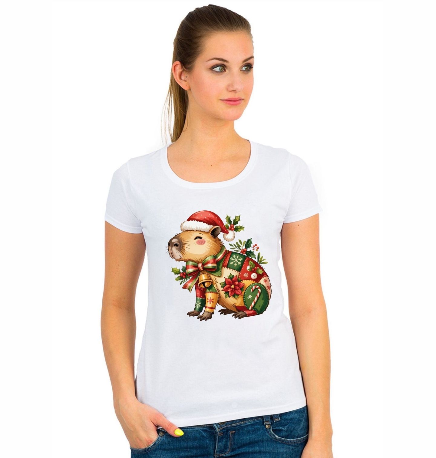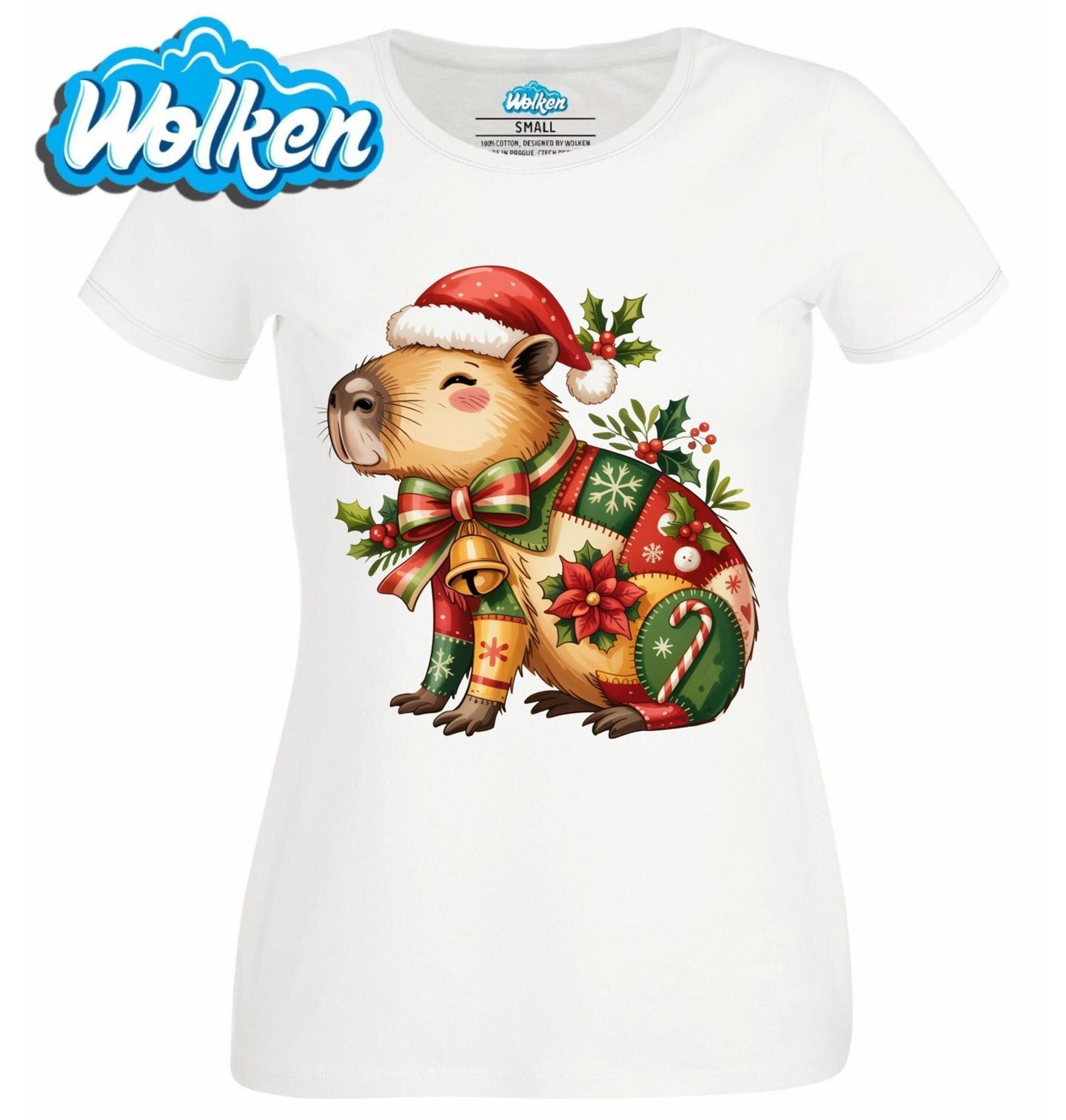 Dámské tričko Vánoční Kapybara ve Svetru. Roztomilý hlodavec ve vánočním svetru, s čepicí a ozdobami je tím pravým symbolem radosti. Tato originální ilustrace spojuje kouzlo Vánoc s klidem a přívětivostí kapybary, která si získala srdce lidí po celém světě. Perfektní motiv pro ty, kdo milují Vánoce s trochou humoru a originality.