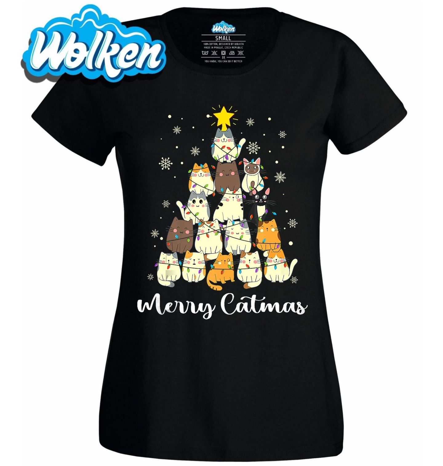 Dámské tričko Vánoční Kočičí Stromek Merry Catmas. Tento originální motiv zachycuje skupinu koček, které se poskládaly do tvaru vánočního stromku, ozdobeného světýlky a hvězdou na vrcholu. Každá kočka má svůj vlastní výraz a dohromady tvoří veselou a roztomilou dekoraci. Pokud milujete Vánoce a kočka je vaším společníkem, tenhle motiv vás rozhodně pobaví.