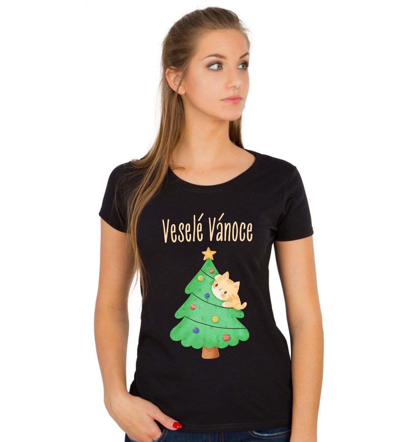 Dámské tričko Vánoční Kočka na Stromečku Veselé Vánoce