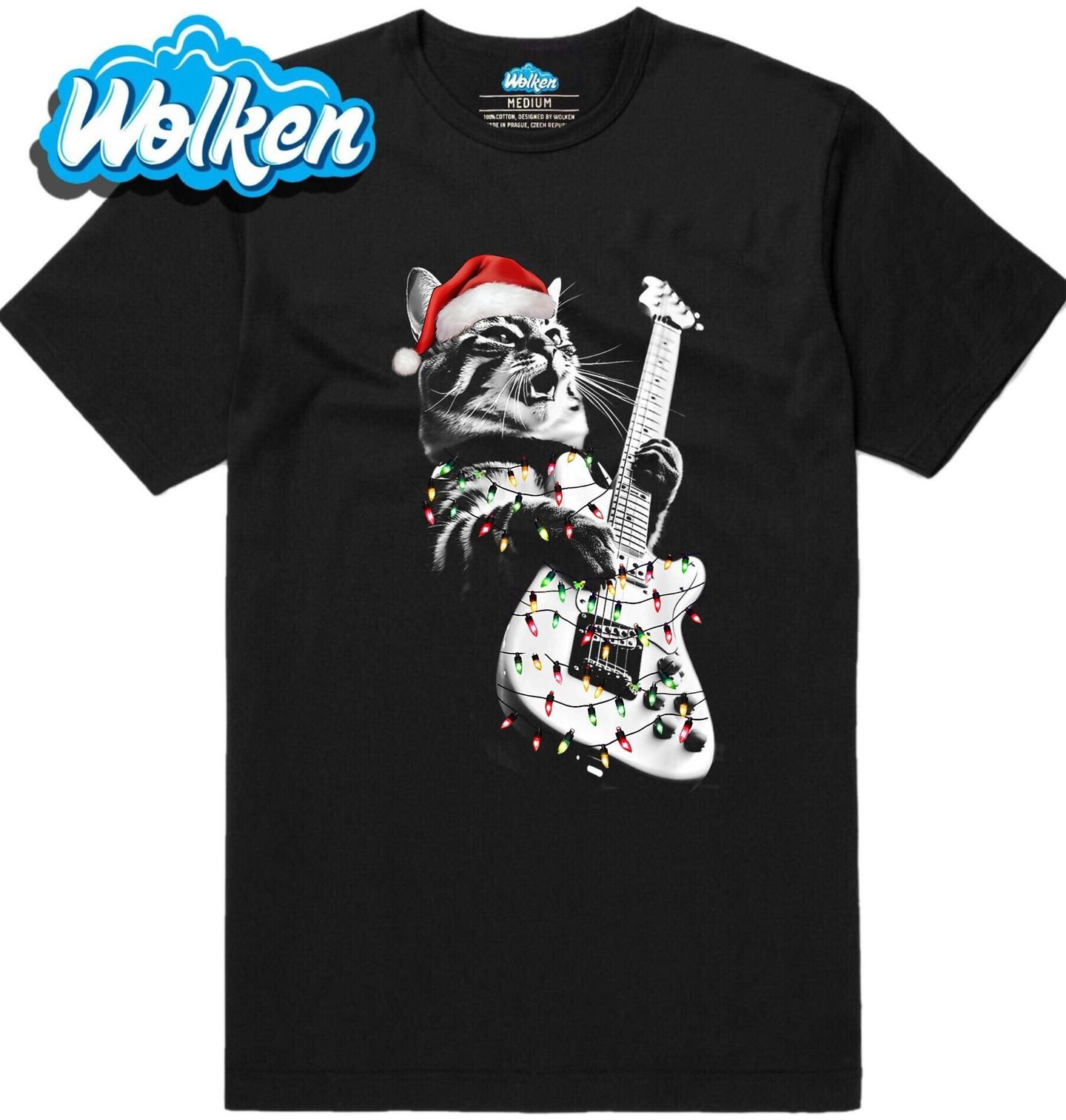 Pánské tričko Vánoční Kočka s Kytarou. Kočka v santovské čepici hraje na elektrickou kytaru obalenou vánočními světýlky a ukazuje, že Vánoce nemusí být jen o koledách, ale klidně i o pořádném rockovém koncertu. Skvělý dárek pro každého, kdo miluje Vánoce a kytara je jeho hudební nástroj.