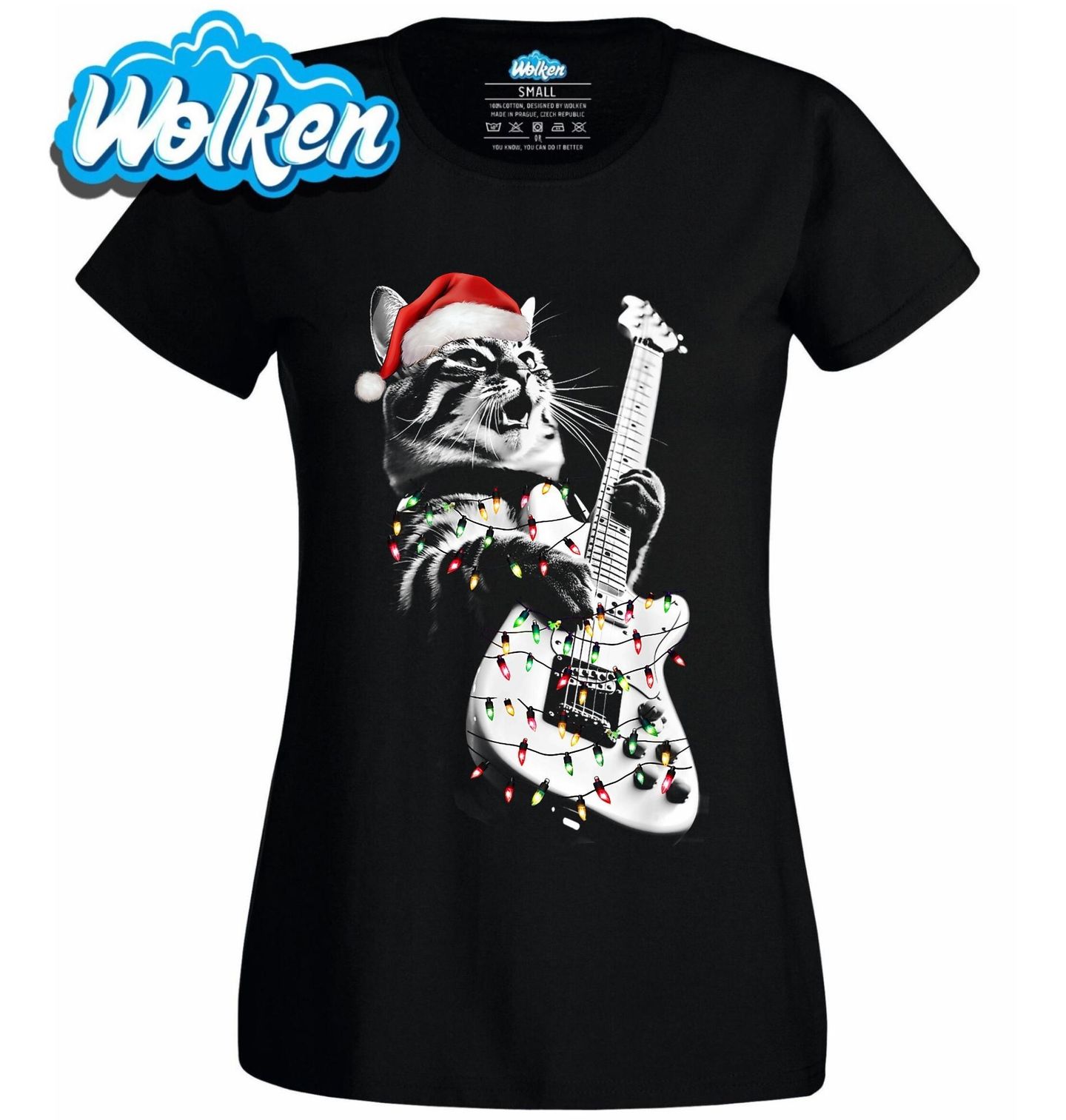 Dámské tričko Vánoční Kočka s Kytarou. Kočka v santovské čepici hraje na elektrickou kytaru obalenou vánočními světýlky a ukazuje, že Vánoce nemusí být jen o koledách, ale klidně i o pořádném rockovém koncertu. Skvělý dárek pro každého, kdo miluje Vánoce a kytara je jeho hudební nástroj.