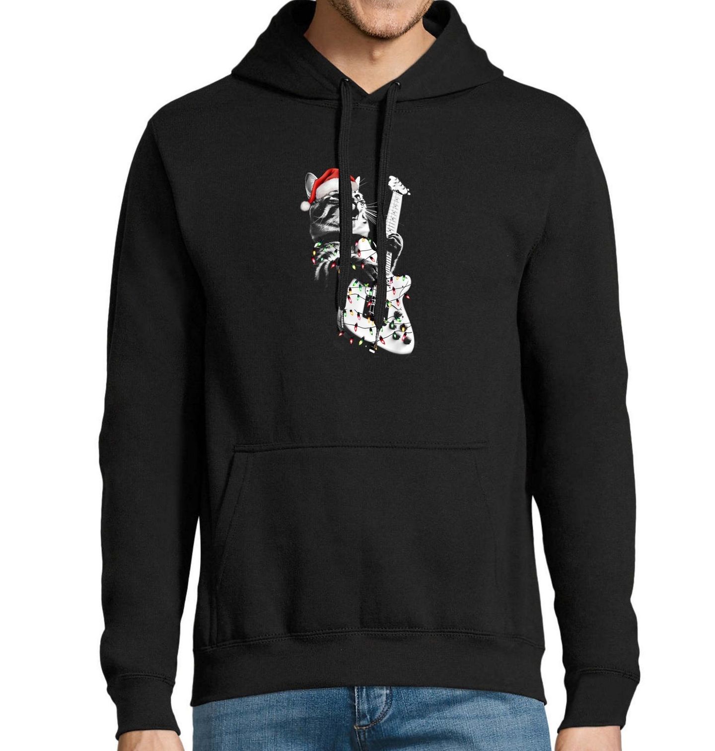 Pánská mikina Vánoční Kočka s Kytarou. Kočka v santovské čepici hraje na elektrickou kytaru obalenou vánočními světýlky a ukazuje, že Vánoce nemusí být jen o koledách, ale klidně i o pořádném rockovém koncertu. Skvělý dárek pro každého, kdo miluje Vánoce a kytara je jeho hudební nástroj.