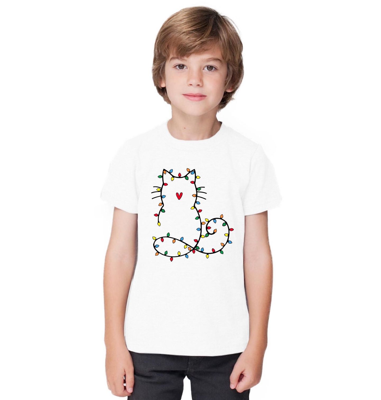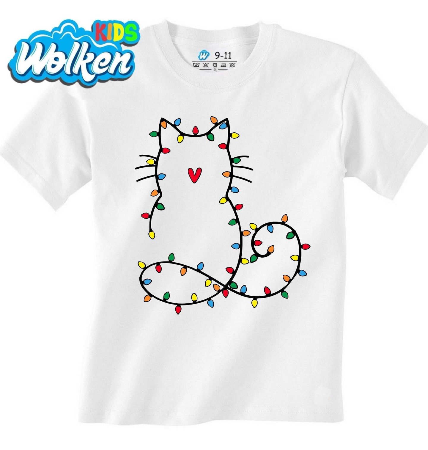 Dětské tričko Vánoční Kočka z Řetězu. Jemný, hravý a láskyplný motiv, který vystihuje podstatu těch pravých svátků. Kočka, obrys tvořený vánočními světýlky, se stává středobodem tohoto originálního trička. Uprostřed srdíčko, které říká víc než tisíc slov – protože s kočkou jsou Vánoce jednoduše krásnější.