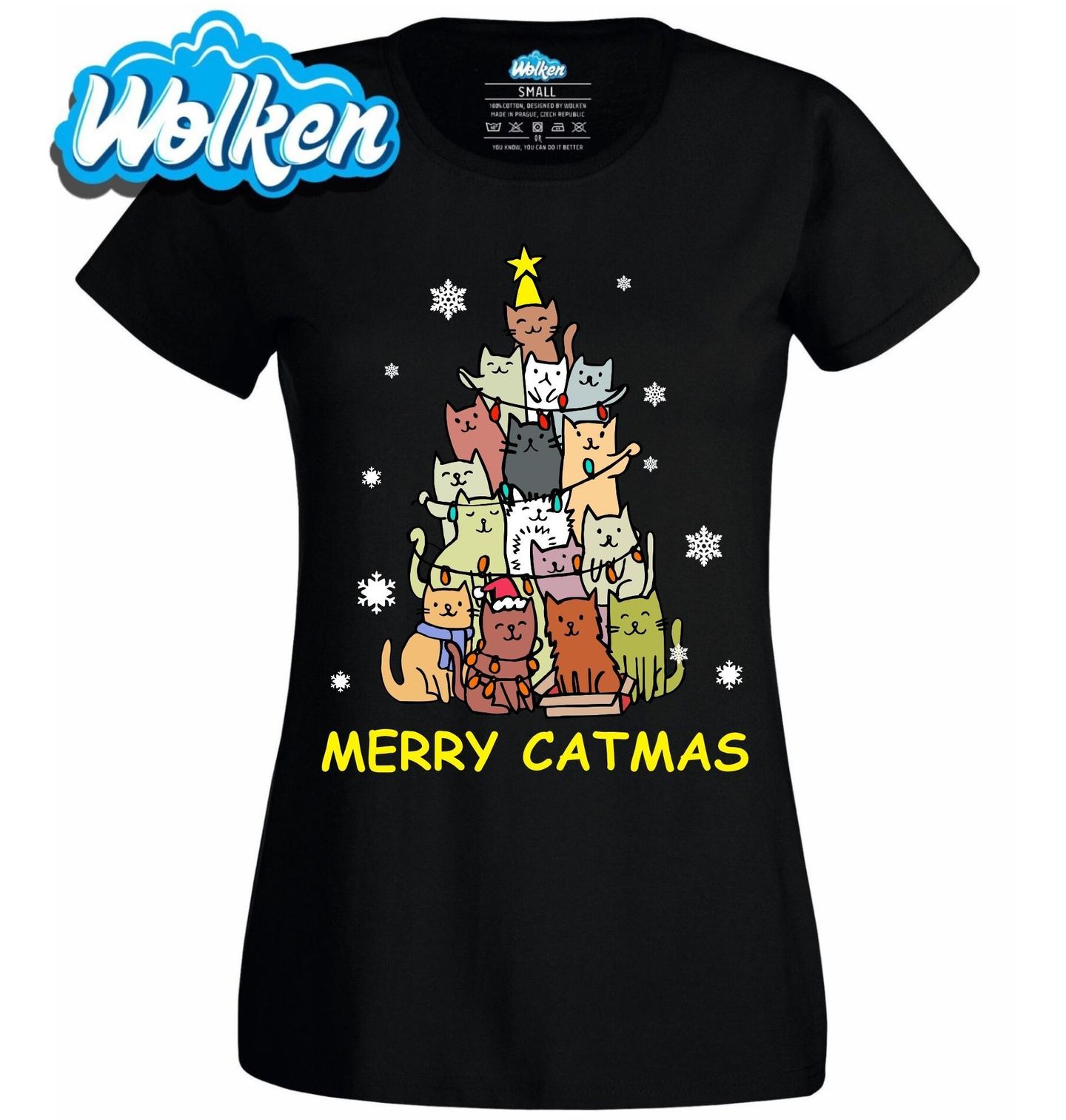 Dámské tričko Vánoční Kočky Merry Catmas. Barevné kočky poskládané do tvaru vánočního stromečku přinášejí radost, hravost a sváteční náladu. Tento veselý motiv kombinuje lásku ke kočkám a kouzlo Vánoc v jednom obrázku. Každá kočka je součástí veselého stromku, doplněného o světýlka, sněhové vločky a úsměvné detaily. Ideální pro každého, kdo slaví Vánoce stylově – s kočkou v hlavní roli.