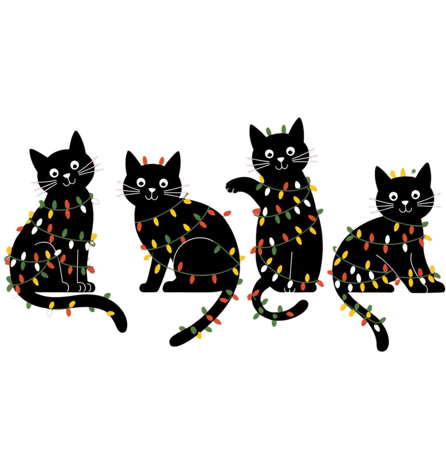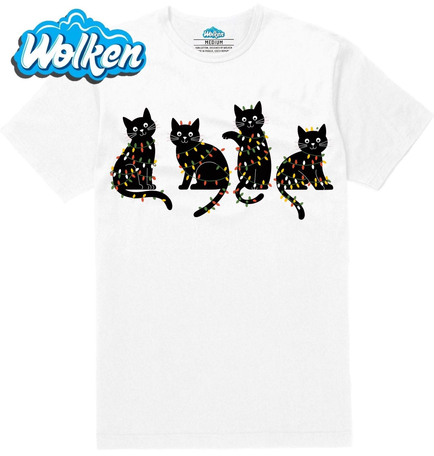 Pánské tričko Vánoční Kočky ve Světýlkách. Roztomilý motiv „kočka ve světýlkách“ pro milovníky svátků i chlupatých mazlíčků. Čtyři černé kočky zamotané do vánočních světýlek připomenou, jak to u stromečku skutečně vypadá. Ideální volba pro každého, kdo miluje kočky, Vánoce a trochu toho chaosu navíc.