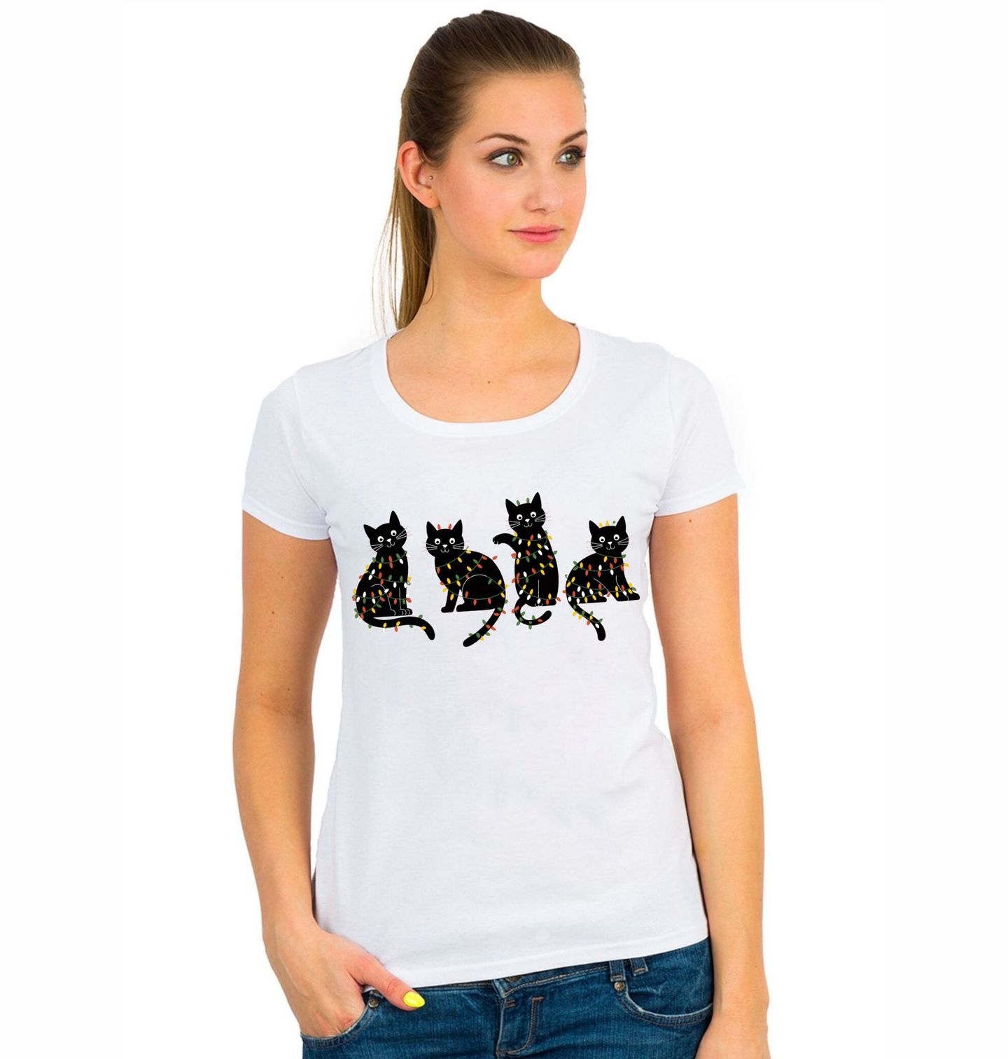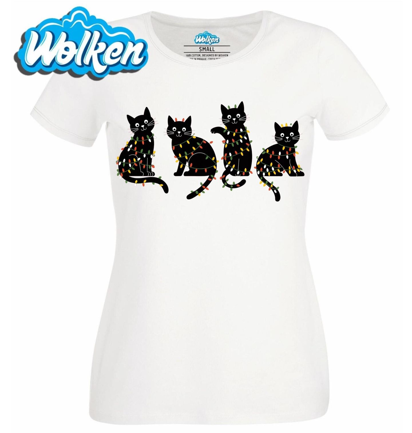 Dámské tričko Vánoční Kočky ve Světýlkách. Roztomilý motiv „kočka ve světýlkách“ pro milovníky svátků i chlupatých mazlíčků. Čtyři černé kočky zamotané do vánočních světýlek připomenou, jak to u stromečku skutečně vypadá. Ideální volba pro každého, kdo miluje kočky, Vánoce a trochu toho chaosu navíc.