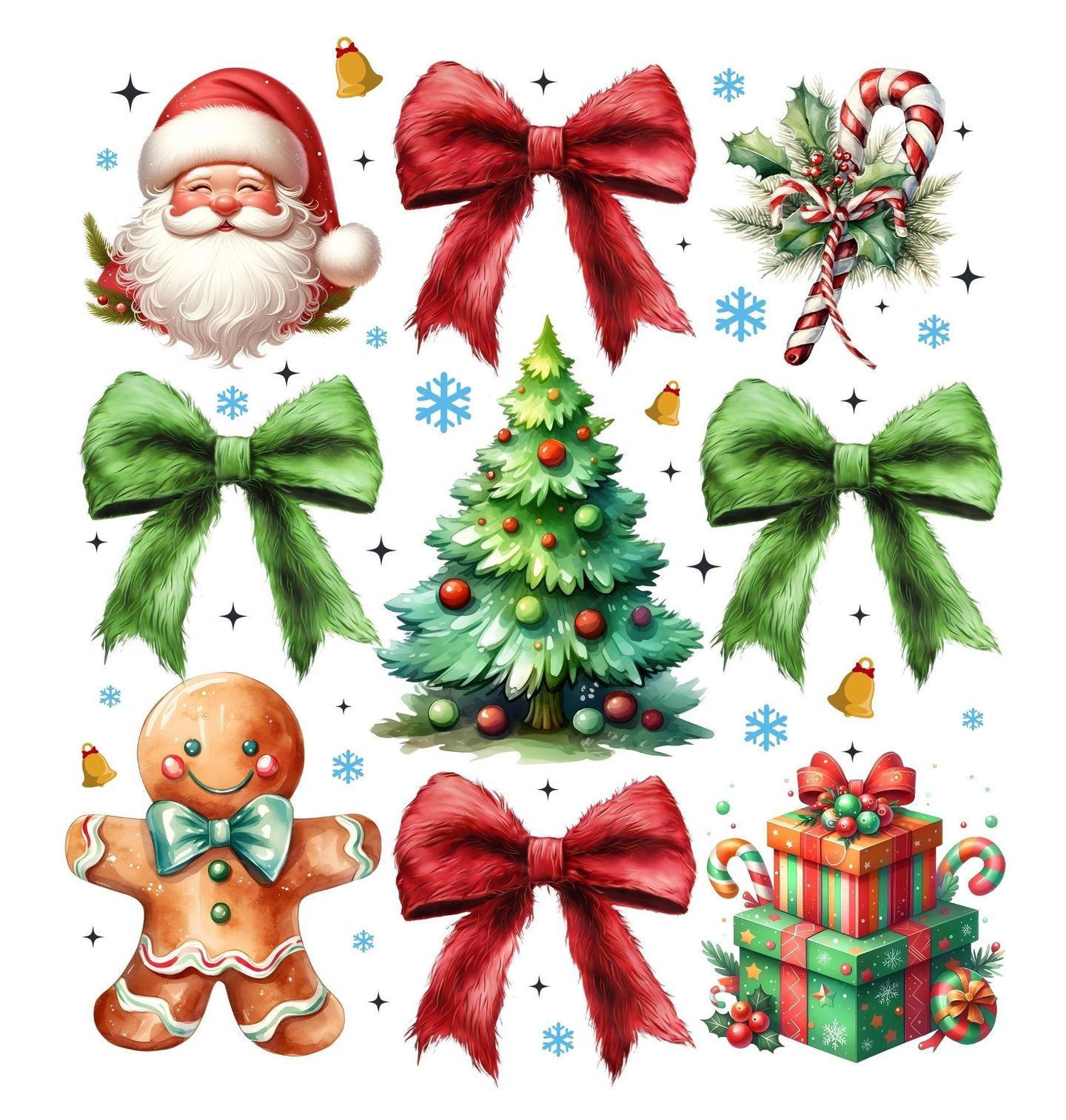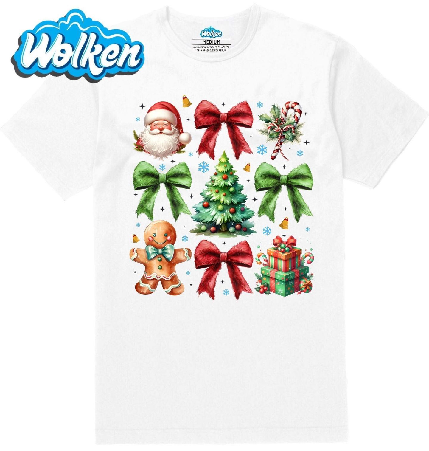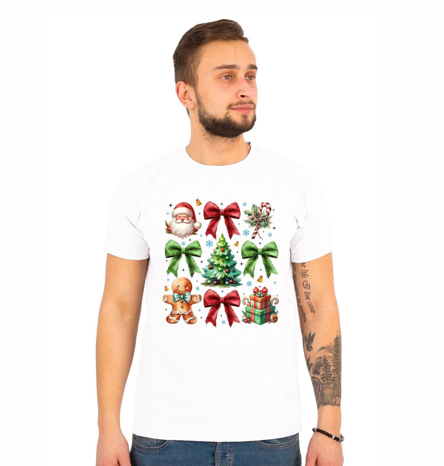 Pánské tričko Vánoční Koláž. Veselé Vánoce na jednom místě! Tento roztomilý a barevný motiv zachycuje vše, co k Vánocům patří – Santovu tvář, perníkového panáčka, ozdobený vánoční stromek, dárky s červenou mašlí, lízátko s cesmínou, zvonečky, vločky a velké zelené i červené mašle.