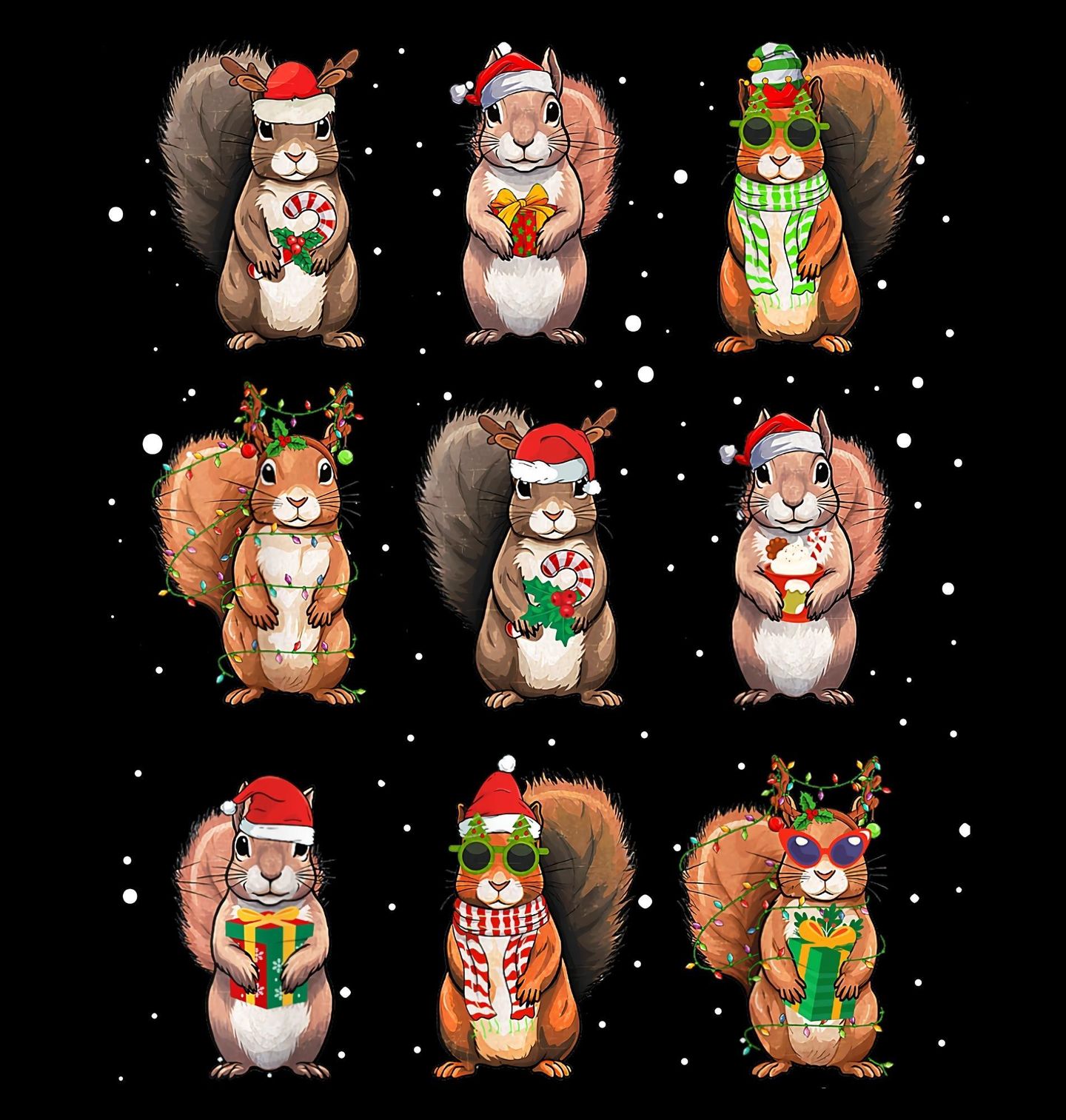 Dámské tričko Vánoční Koláž z Veverek. Rozkošný motiv, kde hraje jsou všechny veverky připravené na Vánoce! Každá veverka má jiný outfit, vánoční doplňky nebo dáreček, a společně tvoří vtipnou a hravou sváteční koláž. Ideální pro milovníky přírody a zvířat, kteří chtějí na Vánoce vykouzlit úsměv.