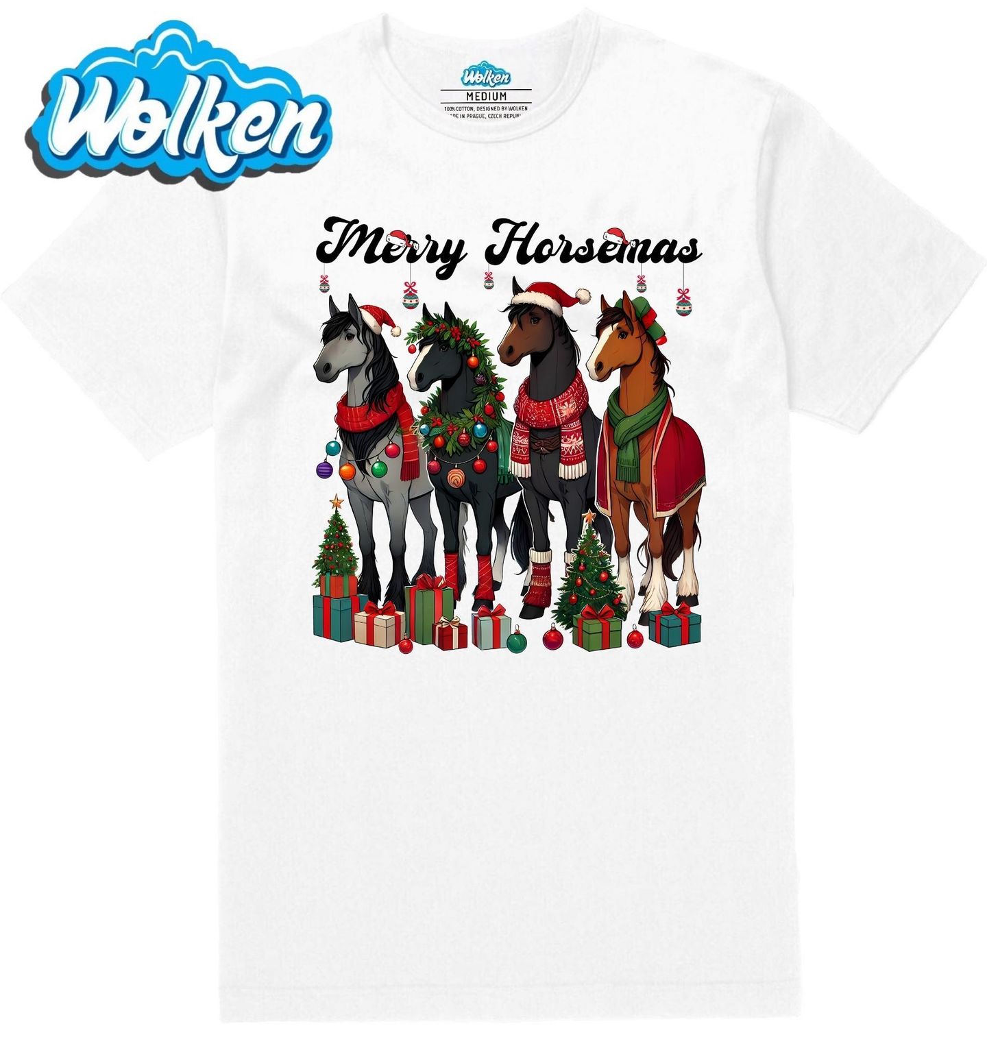 Pánské tričko Vánoční Koně Merry Horsemas. Tento veselý motiv s vánočně oblečenými koni přináší úsměv do každé stáje i domácnosti! Ideální pro každého, kdo miluje kůň, sváteční atmosféru a originální styl. Barevné balíčky, stromečky a vánoční dekorace dodávají motivu tu pravou sváteční jiskru. Skvělý dárek pro milovníky koní i farmáře!