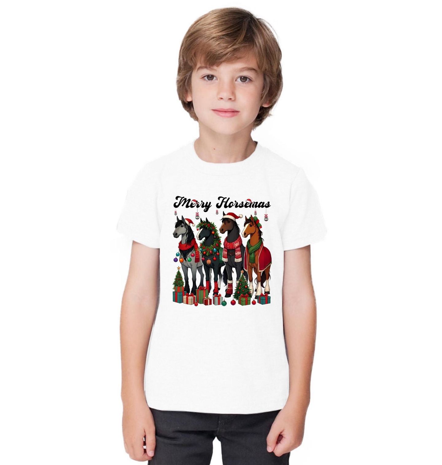 Dětské tričko Vánoční Koně Merry Horsemas. Tento veselý motiv s vánočně oblečenými koni přináší úsměv do každé stáje i domácnosti! Ideální pro každého, kdo miluje kůň, sváteční atmosféru a originální styl. Barevné balíčky, stromečky a vánoční dekorace dodávají motivu tu pravou sváteční jiskru. Skvělý dárek pro milovníky koní i farmáře!