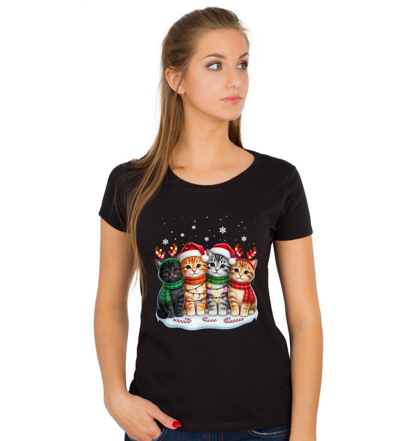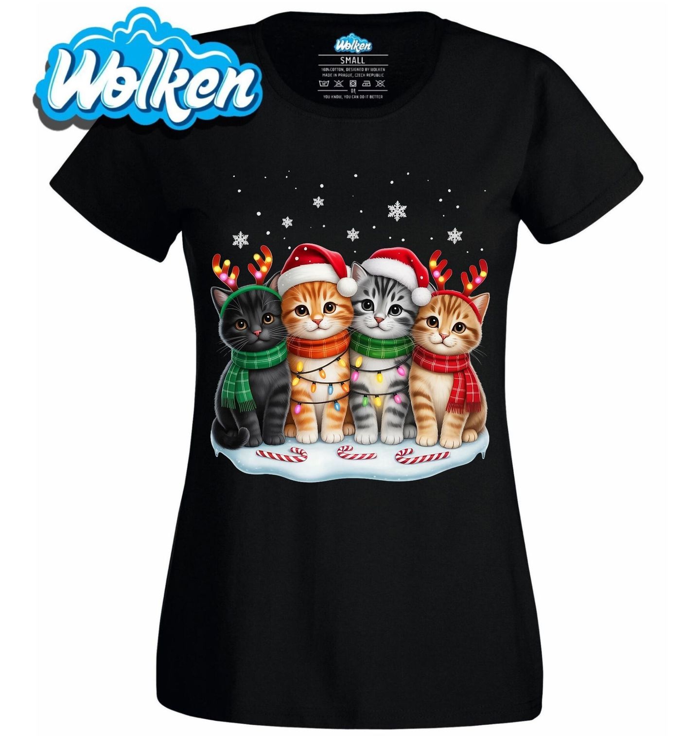 Dámské tričko Vánoční Koťata na Sněhu. Čtveřice roztomilých koťátek, každá kočka oblečená do šály, se santovskou čepicí nebo parožím, stojí spolu na sněhu obklopená světýlky a cukrovými hůlkami. Tento motiv vnáší do Vánoc hravost, pohodu a typickou kočičí roztomilost. Ideální pro všechny kdo milují Vánoce a kočky.