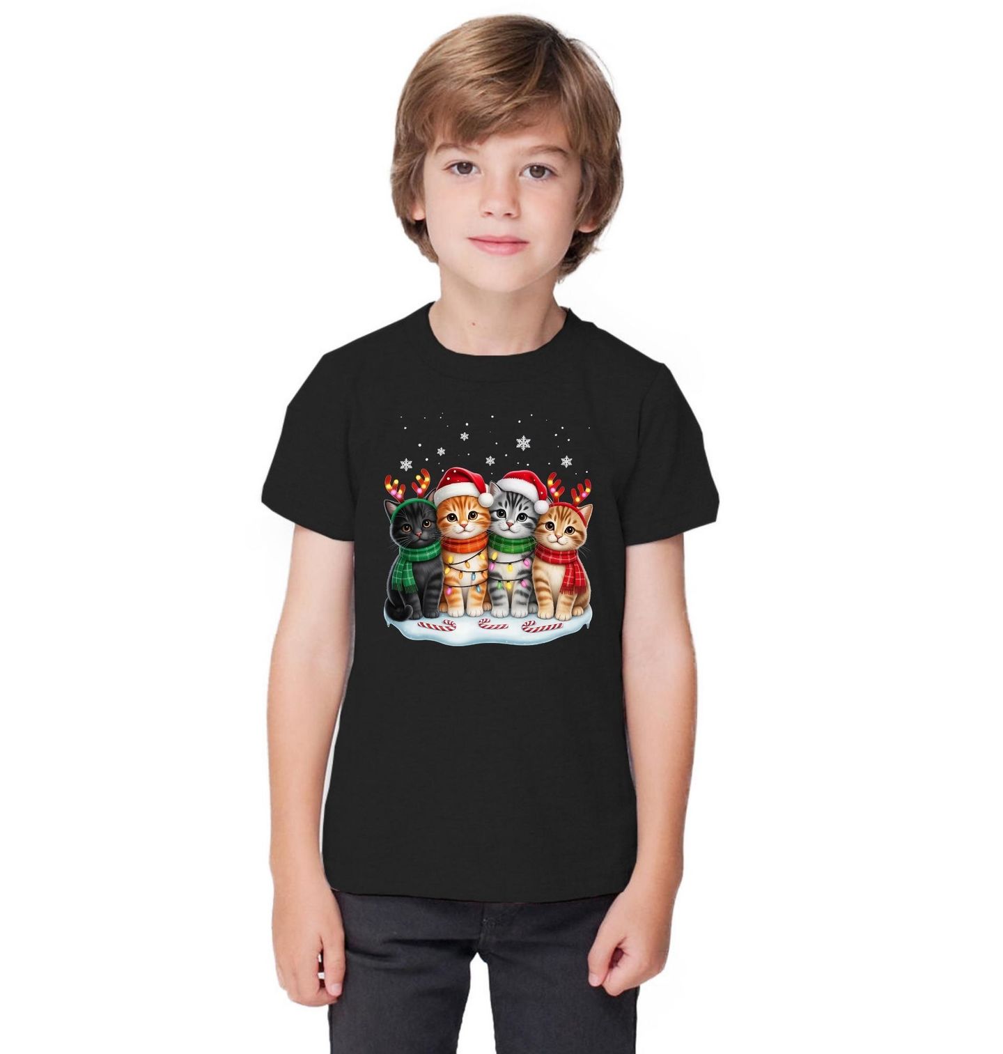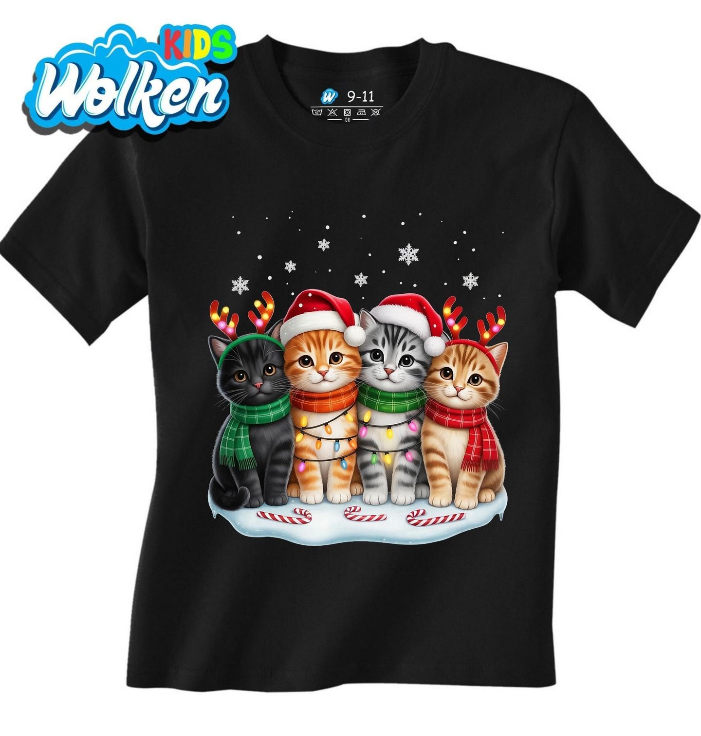 Dětské tričko Vánoční Koťata na Sněhu. Čtveřice roztomilých koťátek, každá kočka oblečená do šály, se santovskou čepicí nebo parožím, stojí spolu na sněhu obklopená světýlky a cukrovými hůlkami. Tento motiv vnáší do Vánoc hravost, pohodu a typickou kočičí roztomilost. Ideální pro všechny kdo milují Vánoce a kočky.