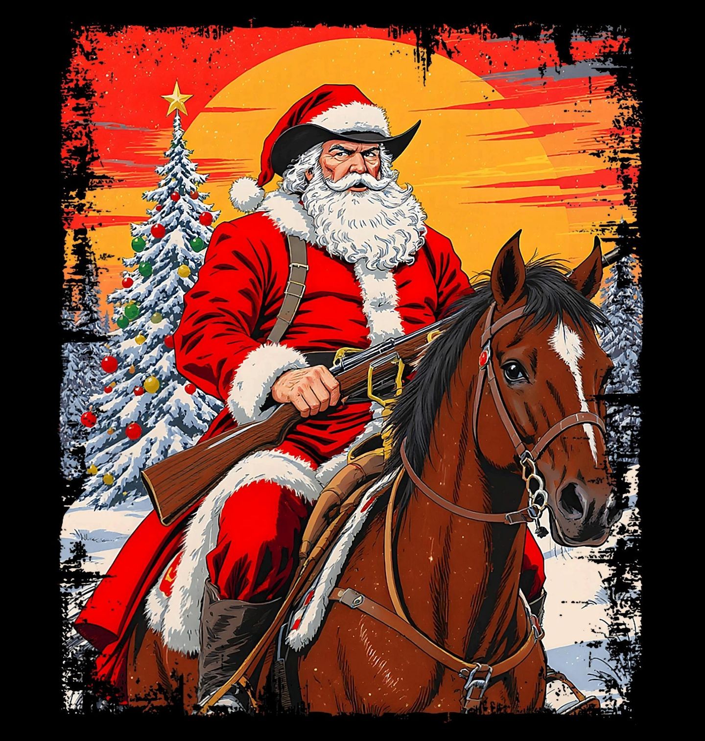 Pánské tričko Vánoční Kovboj Santa na Koni. Santa jako drsný kovboj v červeném obleku, ozbrojený a připravený chránit Vánoce – a to vše v sedle majestátního koně. Ideální pro milovníky originálních svátečních motivů, westernu, akce a pořádného humoru. Vánoční stromek v pozadí a západ slunce dodávají scéně nezapomenutelnou atmosféru.