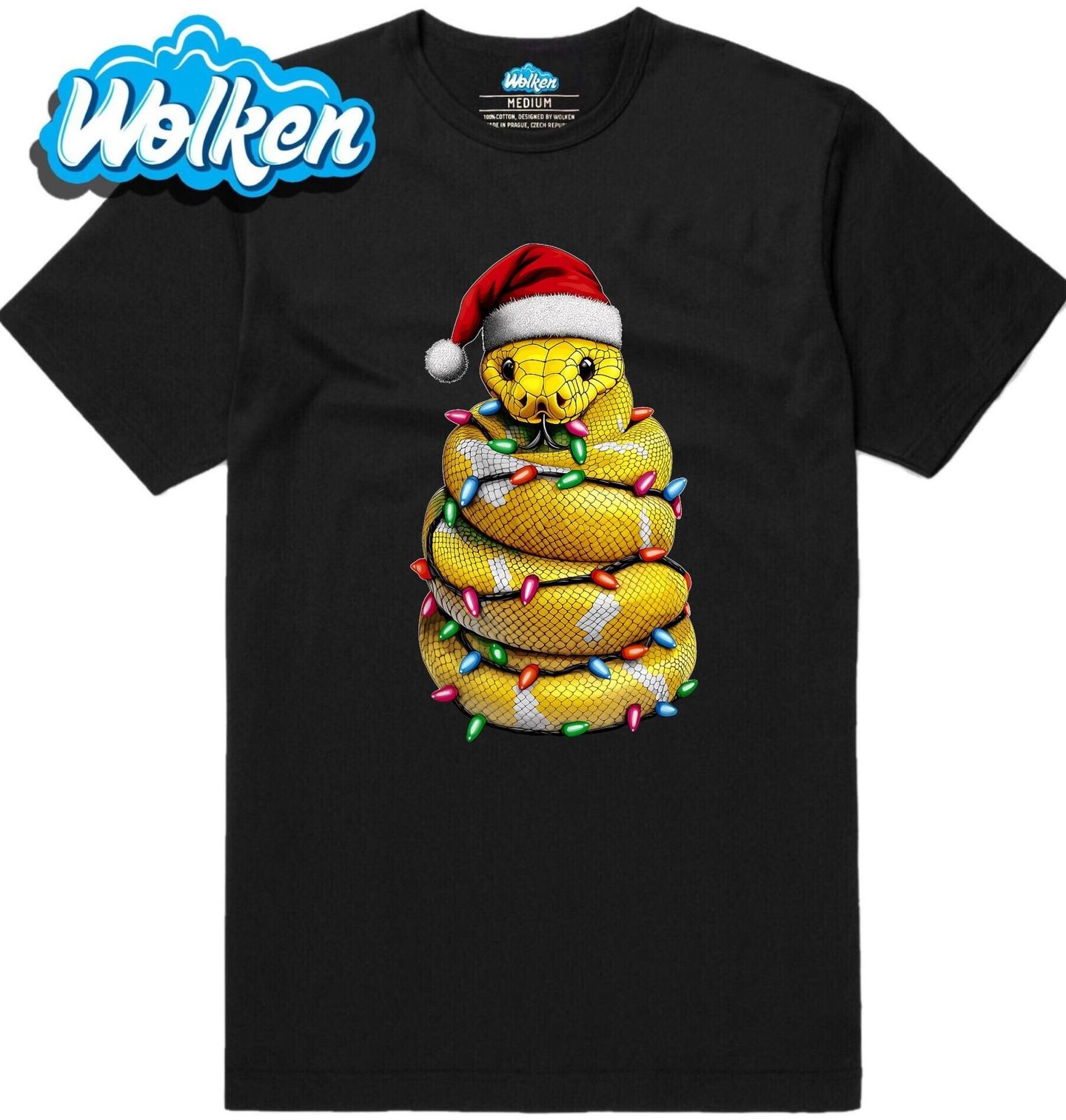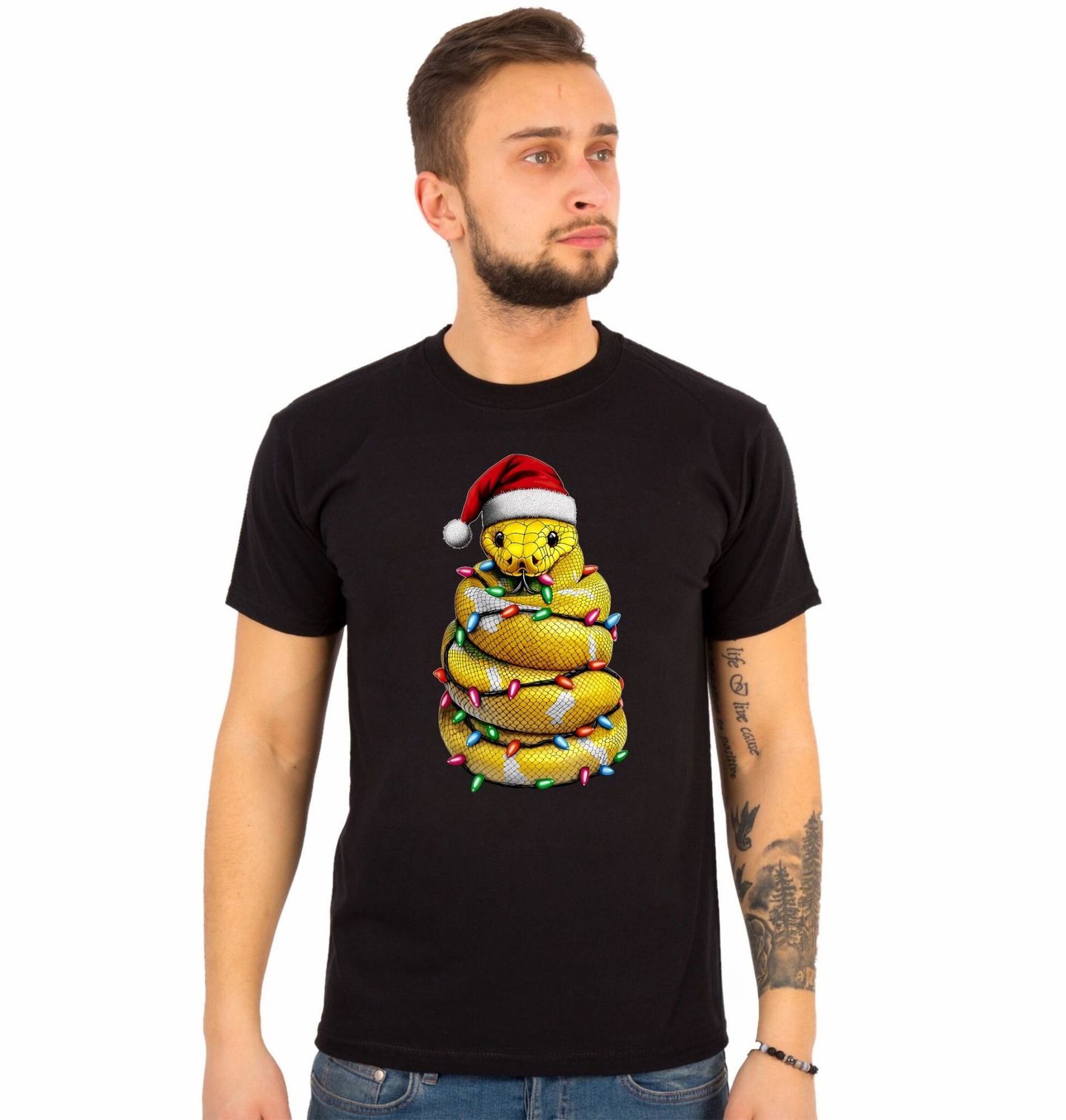 Pánské tričko Vánoční Krajta královská. Oslavte Vánoce netradičně s tímto originálním motivem, kde hlavní roli hraje had – konkrétně ball python, ozdobený barevnými vánočními světýlky a čepicí Santa Clause. Tento design je ideální pro každého, kdo miluje plazy a zároveň chce spojit vánoční atmosféru s netradičním zvířecím motivem.