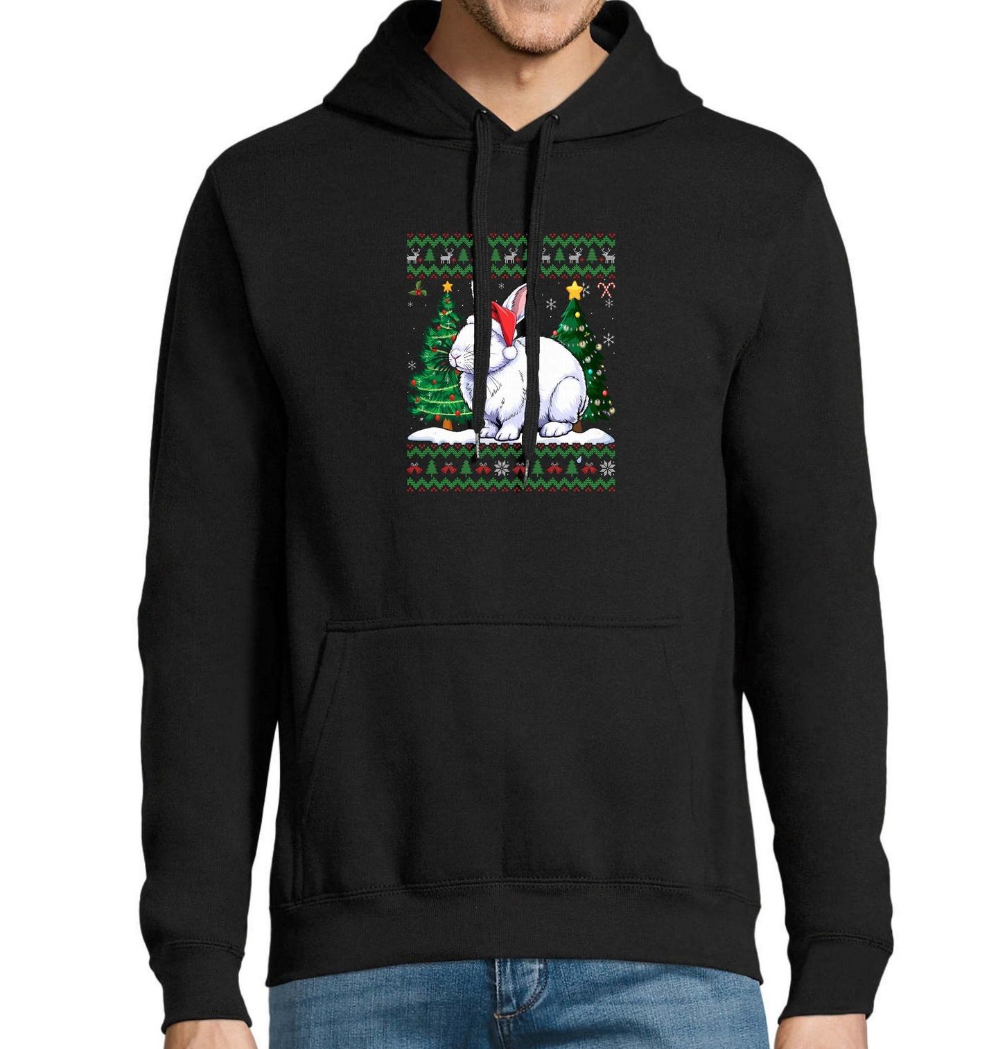 Pánská mikina Vánoční Králík. Originální motiv v duchu „ugly sweater“ spojuje Vánoce a roztomilého bílého králíka v santovské čepici. Tento veselý vánoční design s králíkem obklopeným ozdobenými stromečky je ideální pro všechny milovníky zvířat, domácích mazlíčků a sváteční pohody.