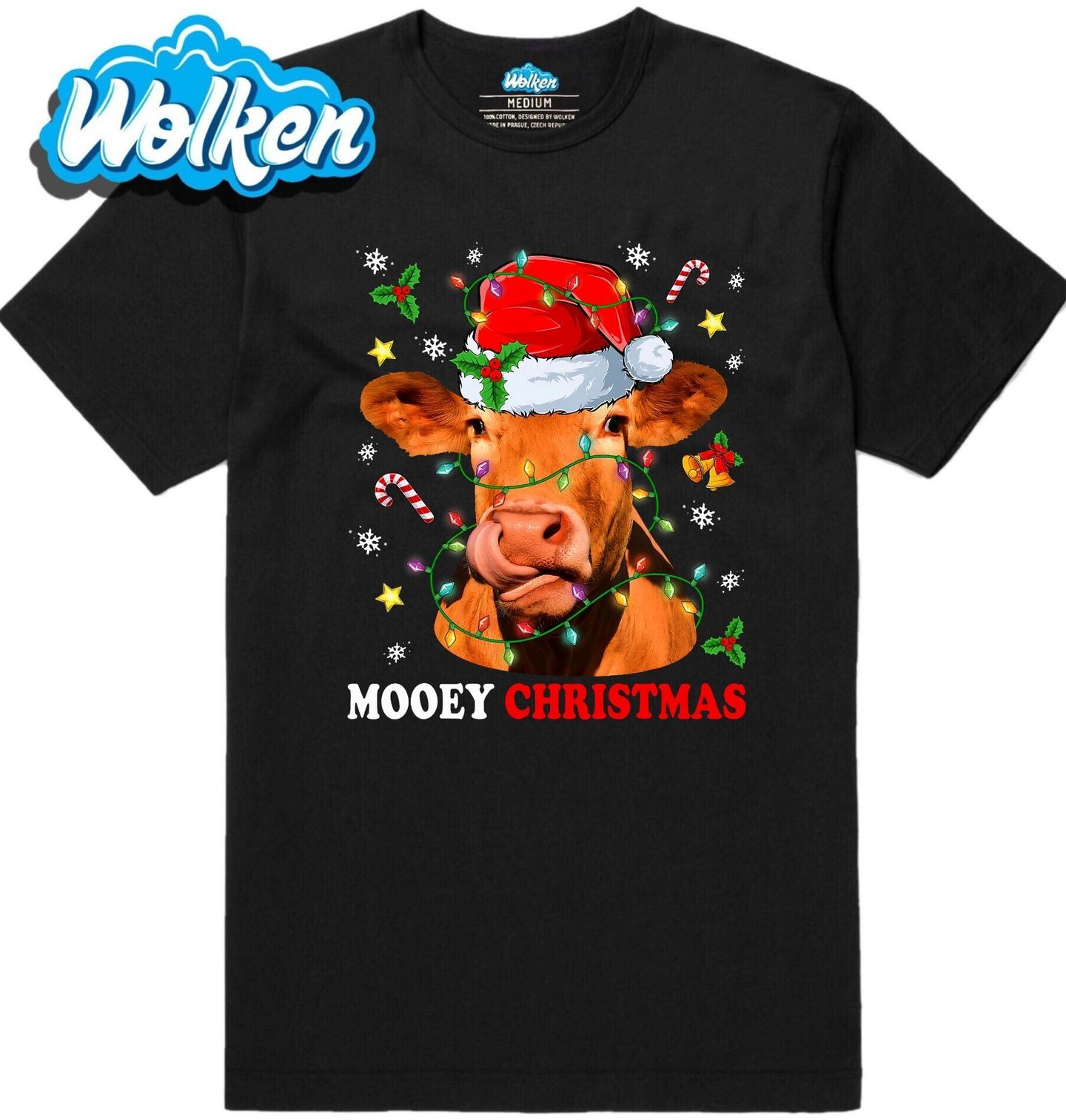 Pánské tričko Vánoční Kráva Mooey Christmas. Veselé Vánoce ve stylu „Mooey Christmas“! Tento originální vánoční motiv s roztomilou krávou v Santa čepici a zamotanou do světýlek potěší každého milovníka zvířat, humoru nebo života na farmě. Ideální pro sváteční pohodu, vánoční večírky nebo jako vtipný dárek.