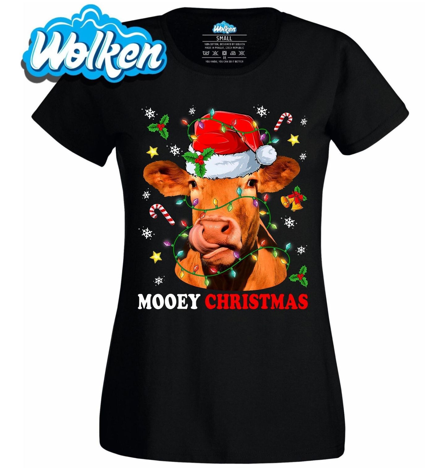 Dámské tričko Vánoční Kráva Mooey Christmas. Veselé Vánoce ve stylu „Mooey Christmas“! Tento originální vánoční motiv s roztomilou krávou v Santa čepici a zamotanou do světýlek potěší každého milovníka zvířat, humoru nebo života na farmě. Ideální pro sváteční pohodu, vánoční večírky nebo jako vtipný dárek.