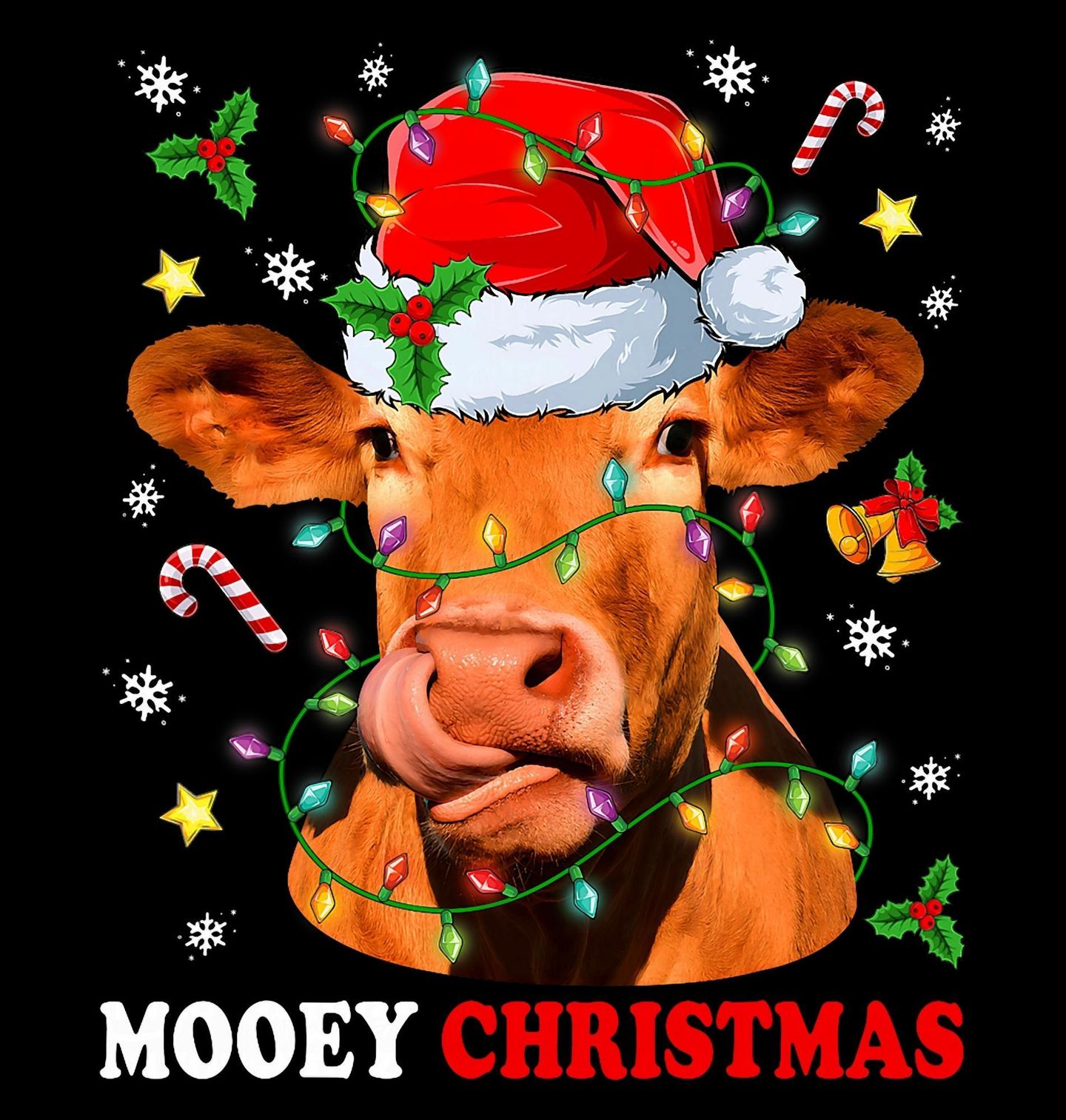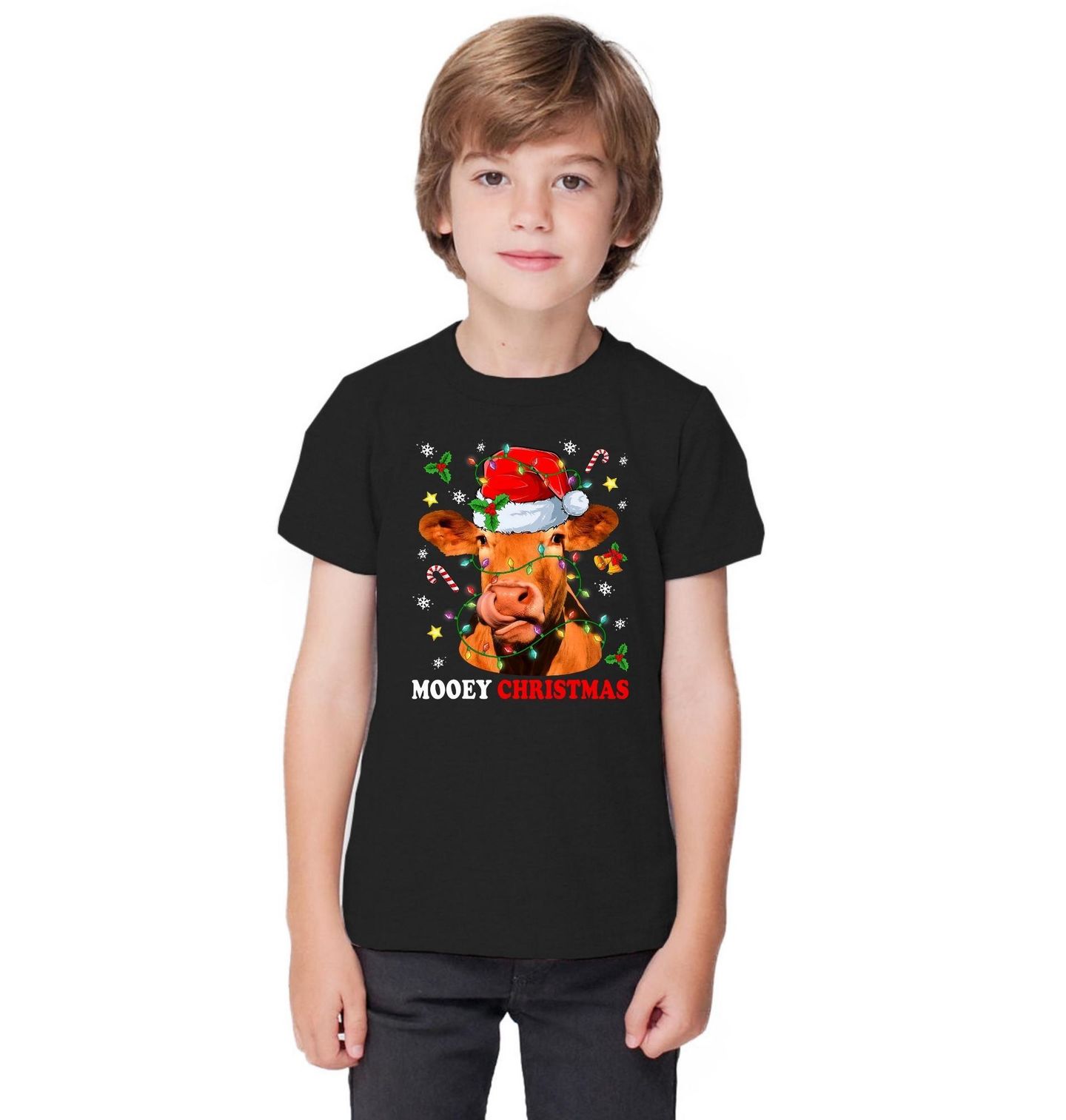 Dětské tričko Vánoční Kráva Mooey Christmas. Veselé Vánoce ve stylu „Mooey Christmas“! Tento originální vánoční motiv s roztomilou krávou v Santa čepici a zamotanou do světýlek potěší každého milovníka zvířat, humoru nebo života na farmě. Ideální pro sváteční pohodu, vánoční večírky nebo jako vtipný dárek.
