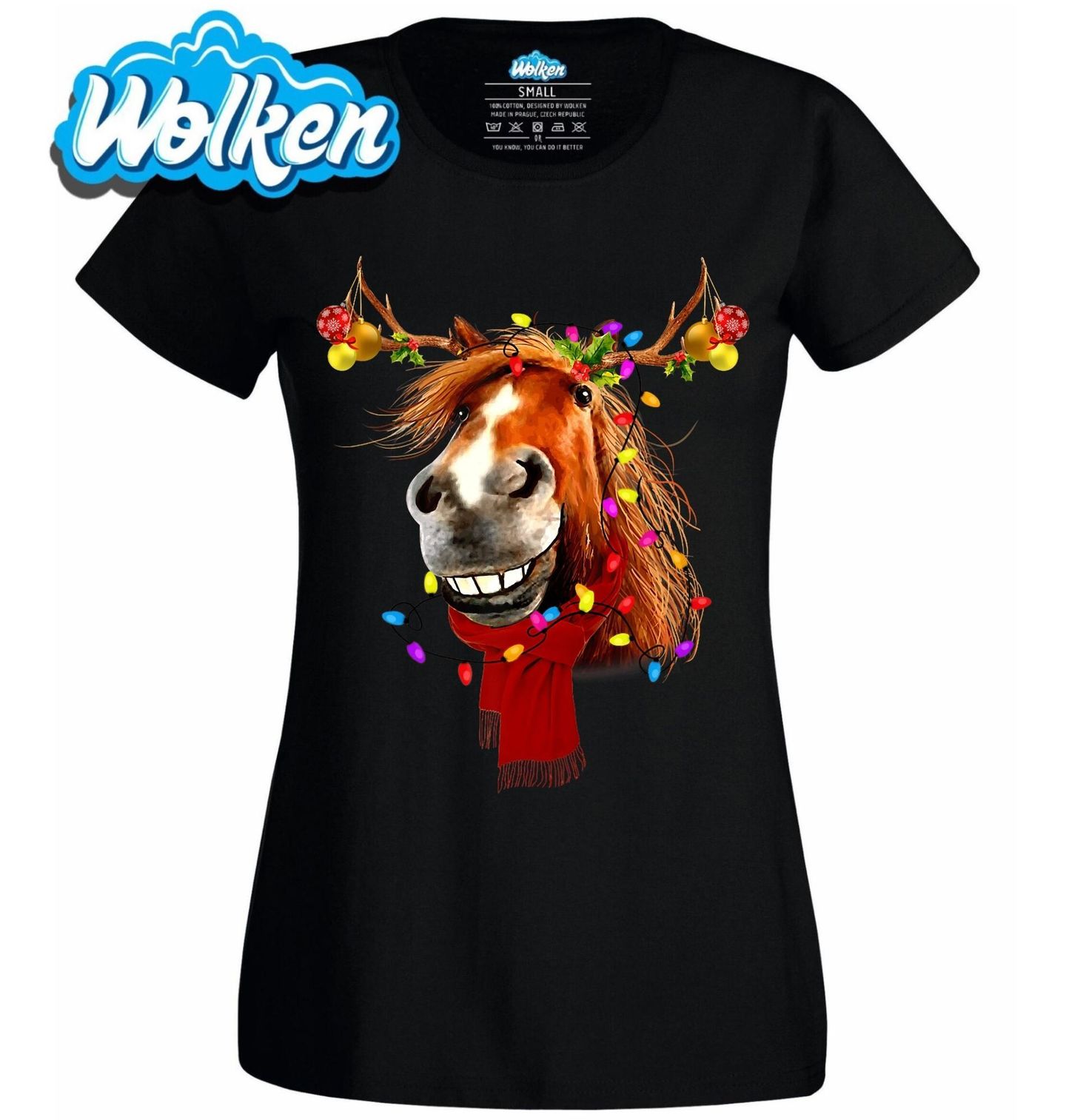 Dámské tričko Vánoční Kůň s Ozdobami. Vánoce přicházejí a s nimi i tento originální motiv koně, který vám vykouzlí úsměv na tváři! Roztomilý kůň plemene Hafling je zde vyobrazen s parohy ozdobenými vánočními baňkami, světýlky a červenou šálou – připravený oslavit svátky s veselou náladou.