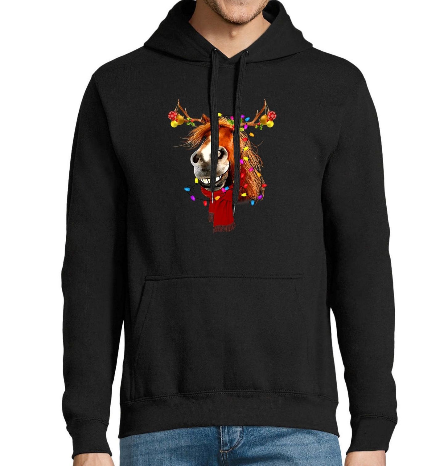Pánská mikina Vánoční Kůň s Ozdobami. Vánoce přicházejí a s nimi i tento originální motiv koně, který vám vykouzlí úsměv na tváři! Roztomilý kůň plemene Hafling je zde vyobrazen s parohy ozdobenými vánočními baňkami, světýlky a červenou šálou – připravený oslavit svátky s veselou náladou.