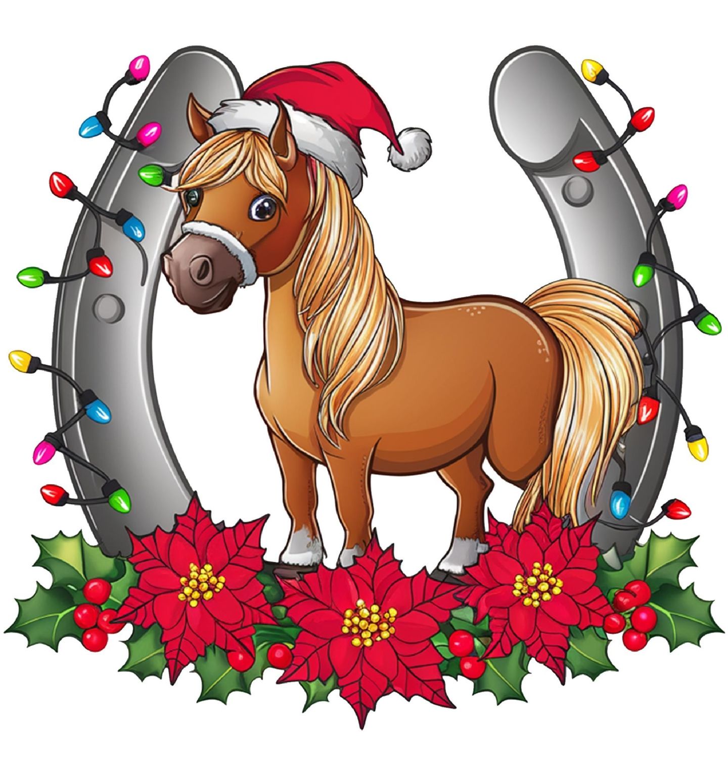Dámské tričko Vánoční Kůň s Podkovou. Na motivu je roztomilý hnědý kůň s vánoční čepicí, stojící před velkou podkovou ozdobenou světýlky. Kolem něj jsou vánoční květy (vánoční hvězda) a cesmína – symboly štěstí a svátků. Ideální pro všechny, kdo milují kůň, Vánoce a pohodu na venkově.