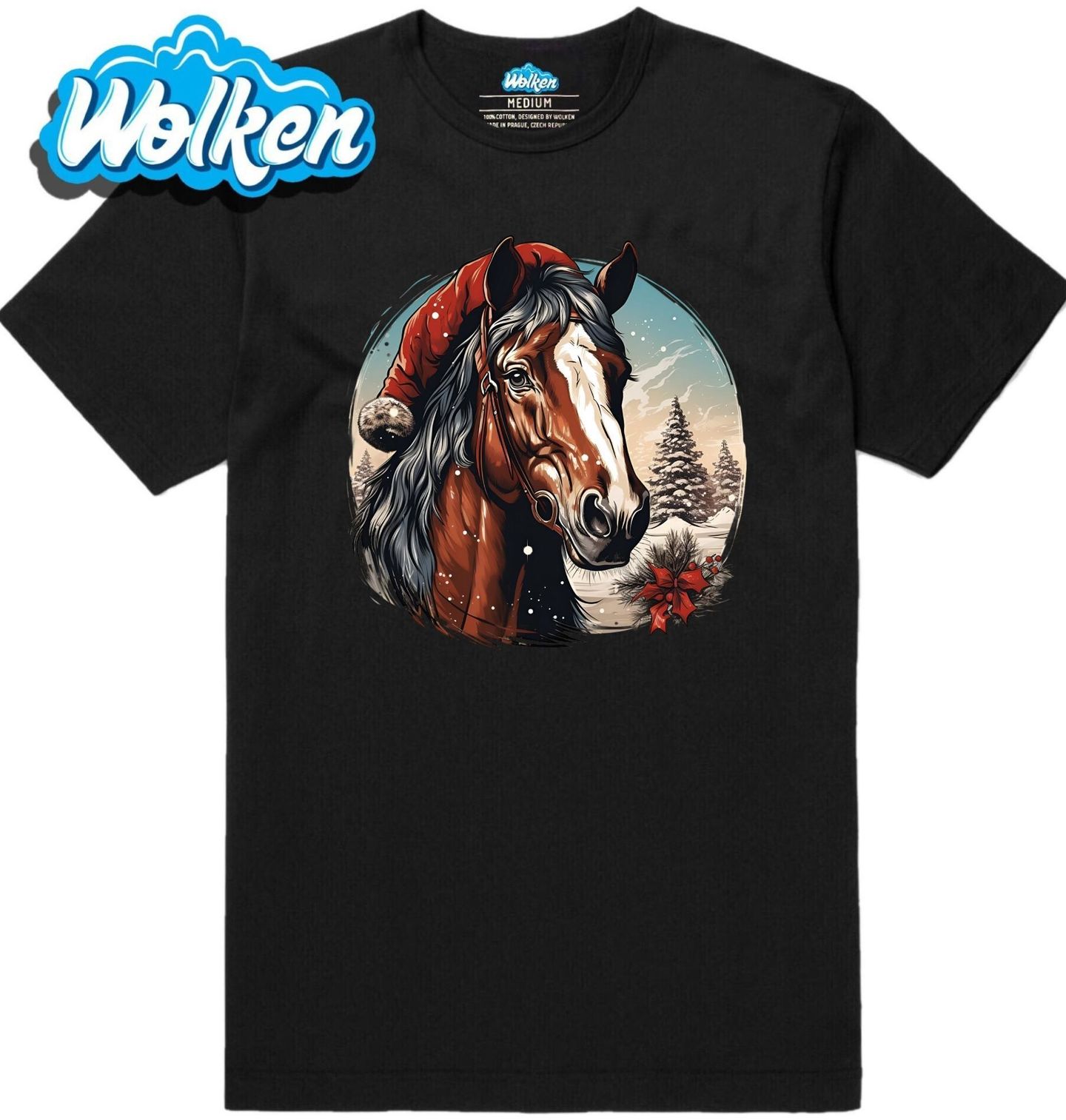 Pánské tričko Vánoční Kůň v Zimní Krajině. Nádherný motiv s koněm ve vánoční čepici, zasněženou krajinou a sváteční dekorací osloví každého milovníka zvířat a zimní atmosféry. Tento design je ideální pro jezdce, pečovatele o koně nebo milovníky venkova.