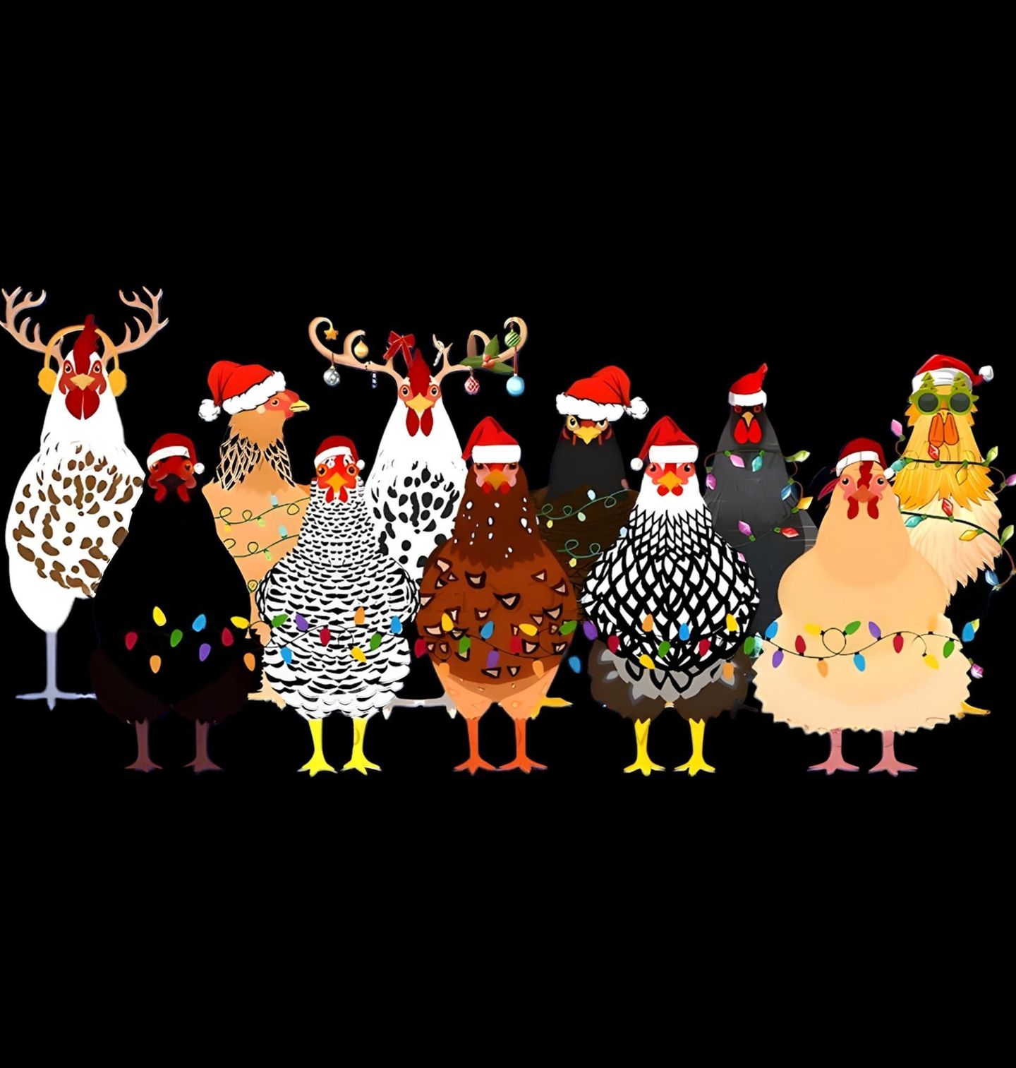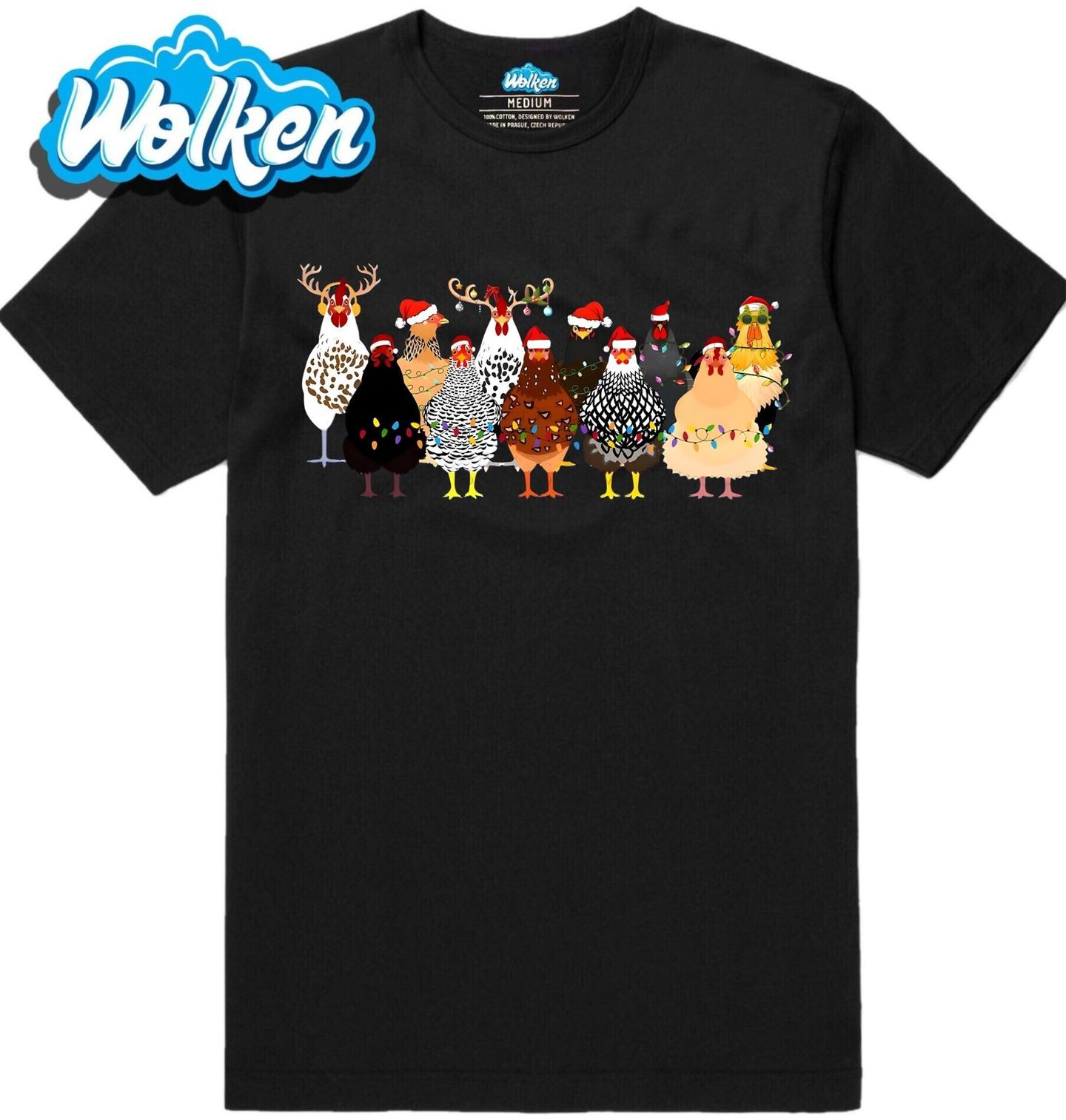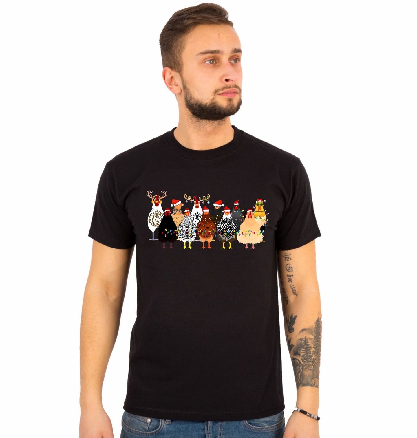 Pánské tričko Vánoční Kurník Slepic. Tohle nejsou obyčejné slepice – tohle je parádně vyfešákovaná slepičí parta připravená na Vánoce! Slepice v čepicích, vánočních světýlkách a se sobími parohy – ano, přesně takhle vypadá drůbeží oslava svátků!