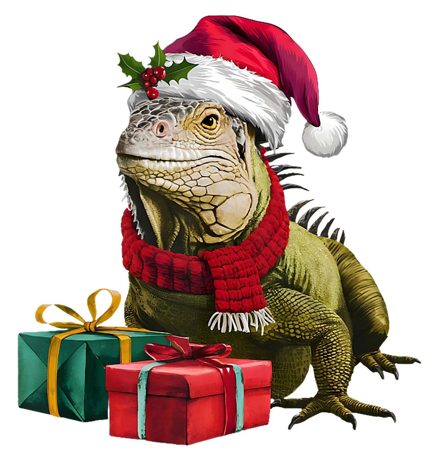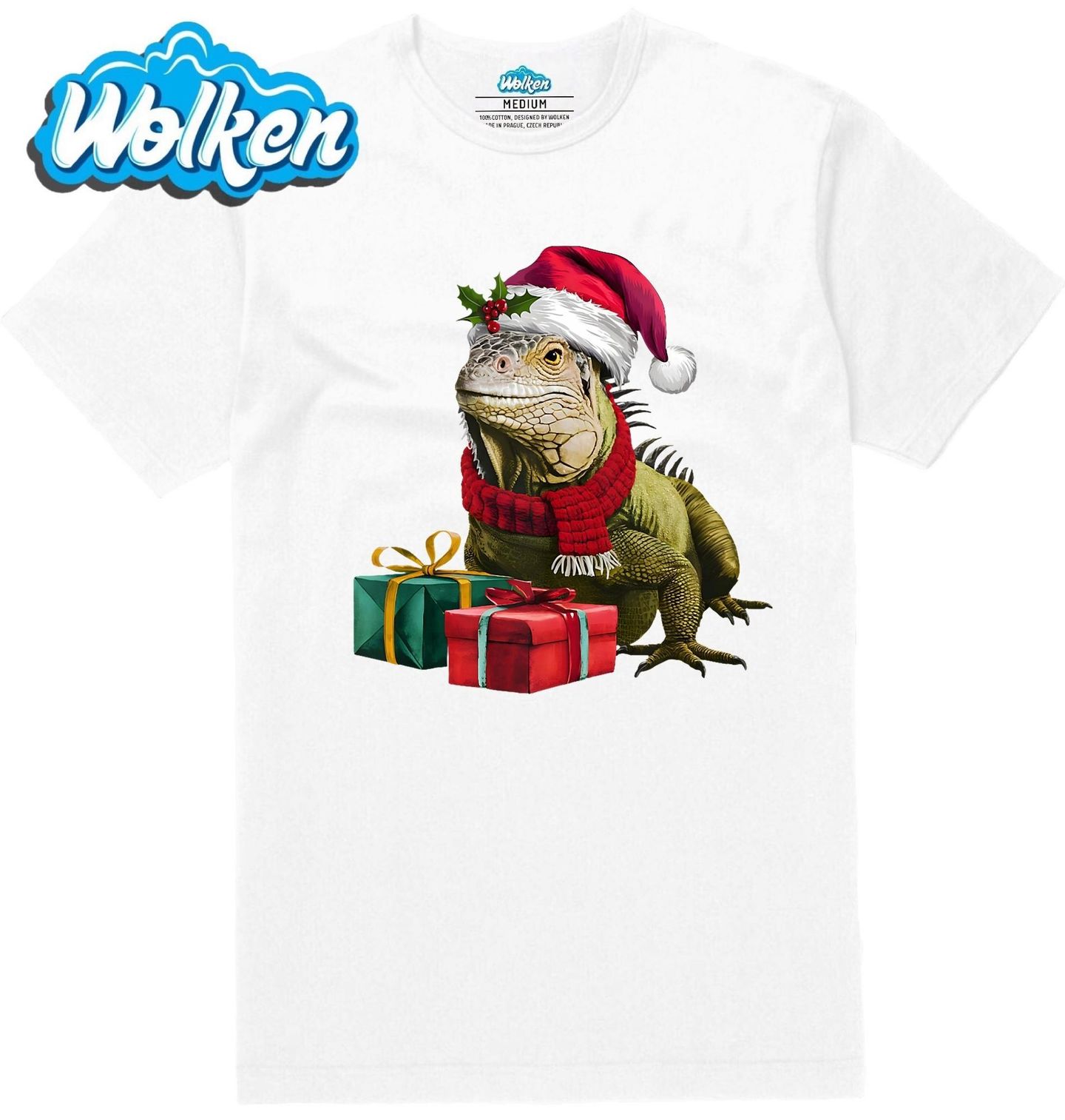 Pánské tričko Vánoční Leguán. Přivítejte Vánoce s jedinečným motivem, na kterém se vyjímá ještěr v Santa čepici, šále a s dárky připravenými pod stromeček. Tento originální design je ideální pro všechny milovníky plazů, kteří chtějí vnést do sváteční atmosféry trochu exotiky a netradičního kouzla.
