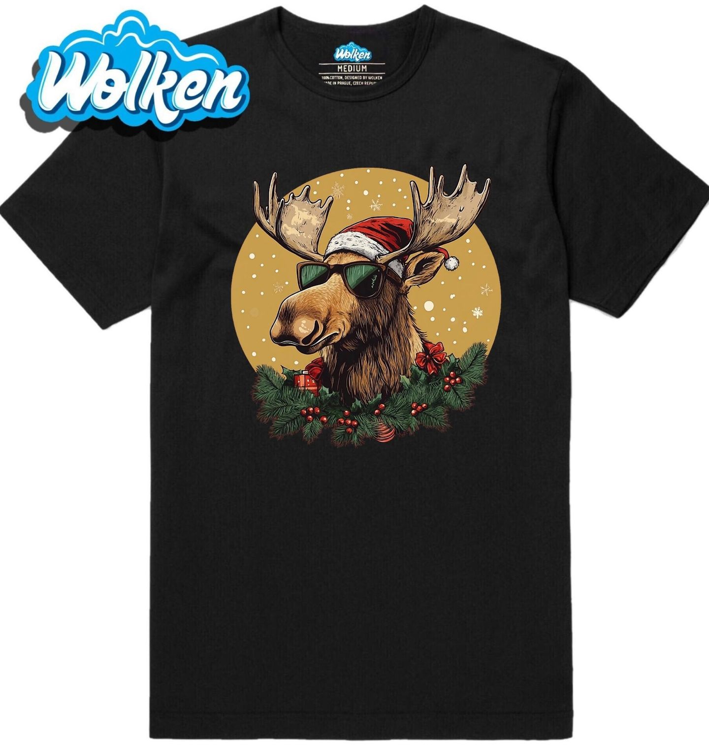Pánské tričko Vánoční Los v Brýlích. Oslavte Vánoce s originálním motivem losa, který nosí čepici Santa Clause, brýle a vánoční ozdoby. Tento vtipný a moderní design je ideální pro každého, kdo má rád netradiční vánoční motivy a zvířata.