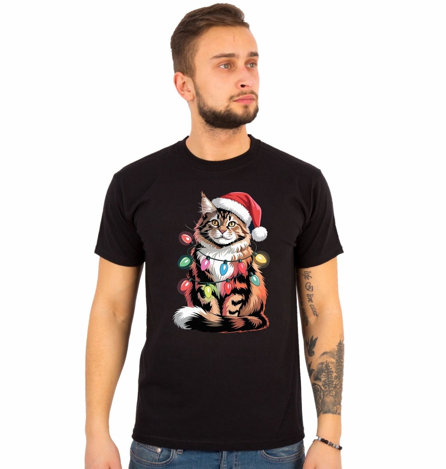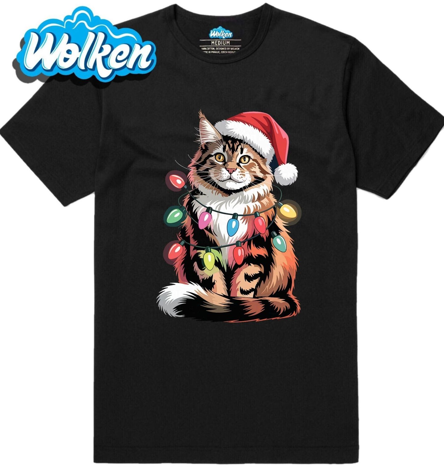 Pánské tričko Vánoční Mainská Kočka. Elegantní a hrdá kočka plemene mainská mývalí sedí klidně s čepicí Santa Clause a omotaná barevnými vánočními světýlky. Tento motiv spojuje majestátní vzhled této kočky s hravostí a atmosférou Vánoc. Ideální pro všechny kdo milují Vánoce a kočky.