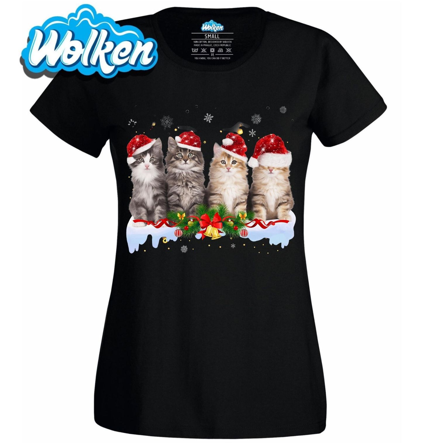 Dámské tričko Vánoční Mainské Kočky. Čtveřice huňatých koček plemene mainská mývalí v typických červených čepicích vytváří dokonalou vánoční atmosféru. Motiv je doplněn o sněhové vločky, ozdoby a sváteční dekorace, které zvýrazňují kouzlo Vánoc. Ideální pro všechny kdo milují Vánoce a kočky.